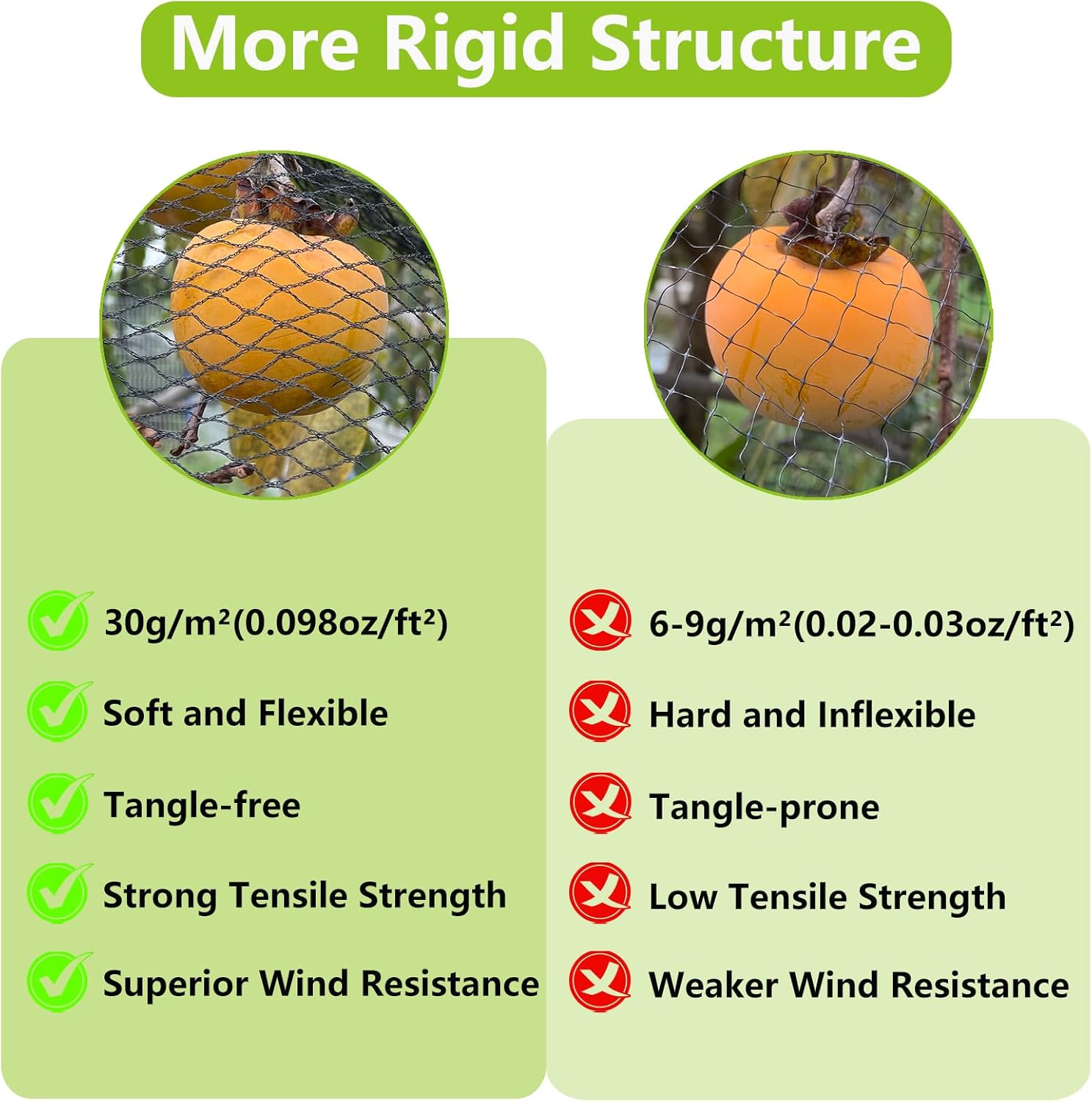 - All-Season Netting for Garden Protection: This bird netting for garden offers year-round protection for your plants, fruits, vegetables and flowers from animals such as birds, deer, squirrels, rabbits, raccoons, poultry and other animals. The tight woven mesh design creates a strong barrier without disrupting plant growth, making it perfect for safeguarding vegetable gardens, fruit trees, flower beds, shrubs, and ponds. Ideal for protecting delicate crops such as blueberries, strawberries, and cherries, this garden netting effectively keeps unwanted critters out while supporting healthy, natural growth