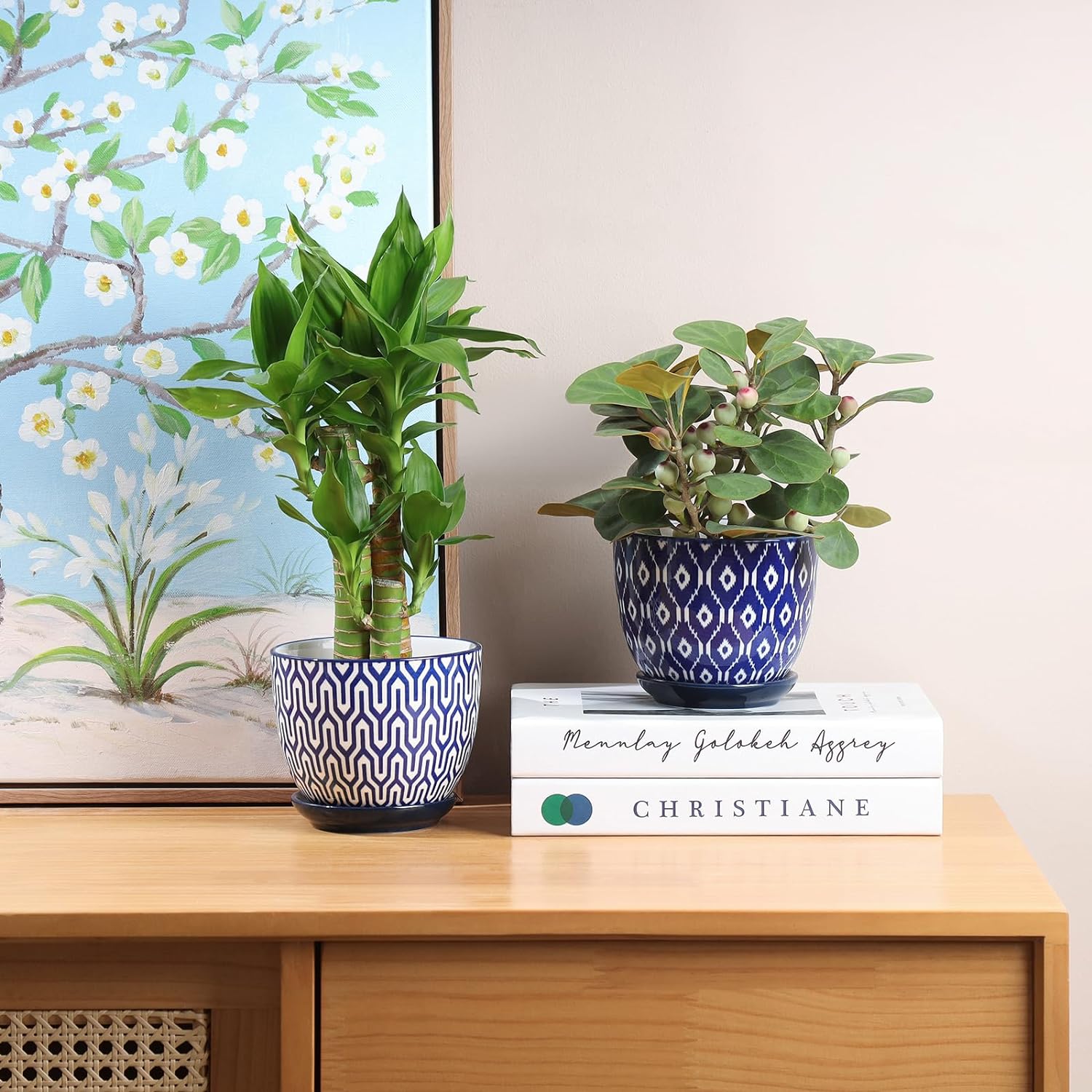 Selamica Ceramic Plant Pots, 4.6 Inch Flower Pots for Indoor Plants, Succulent Pots with Drainage Hole & Saucer, Succulent Planters for Succulent Cactus, Home Decor, Set of 4, Vintage Blue
