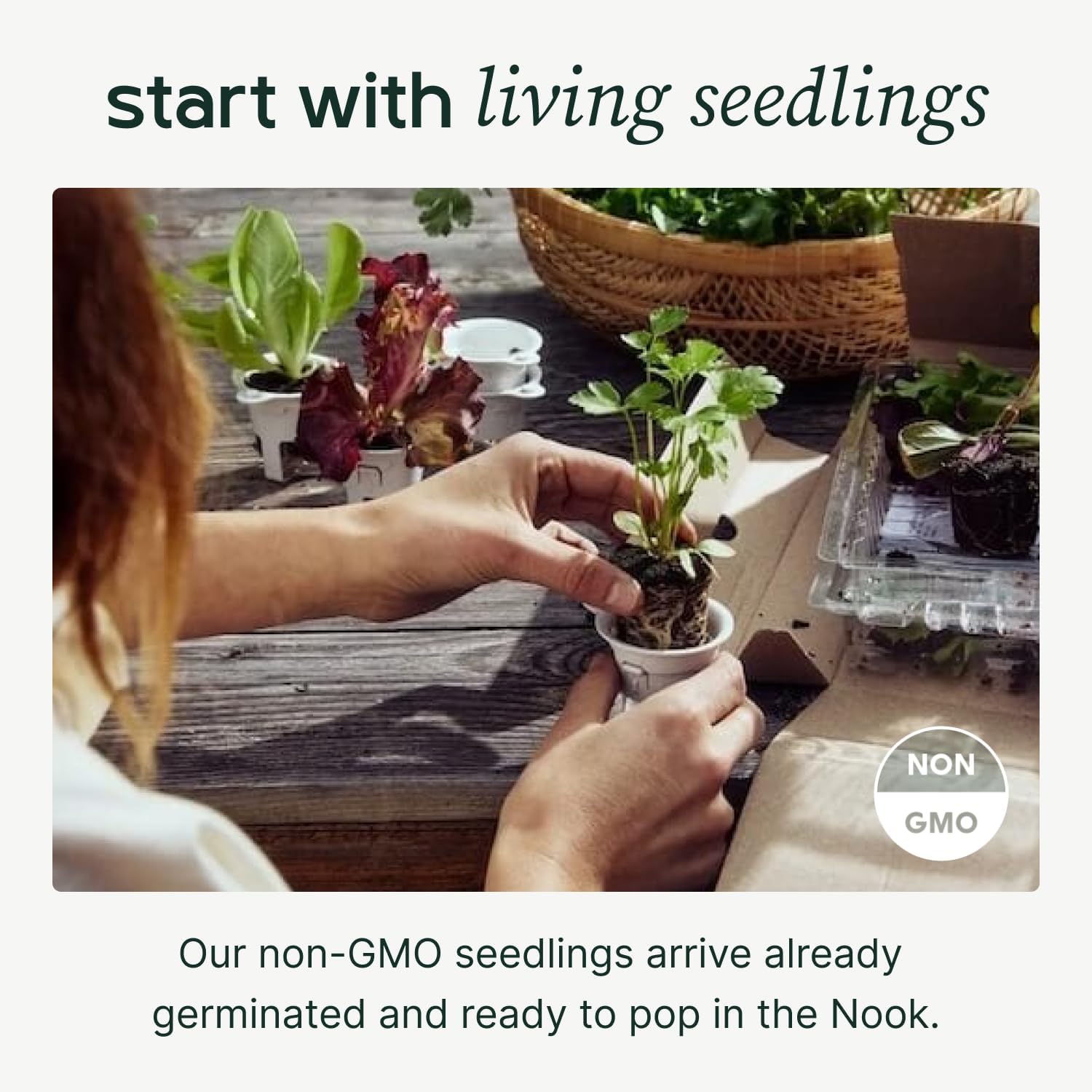 - 20 SEEDLING CREDITS: This starter kit includes a unique QR code on your Farmstand Nook packing slip with instructions to redeem 20 seedlings from our website. Your special seedling bundle includes the best veggies, leafy greens, herbs, fruits and lettuce of the season. These pesticide free, non-GMO, pre-grown plants will have you harvesting 3 weeks early and help ensure your success. Seedlings not shippable to U.S. outlying territories.
