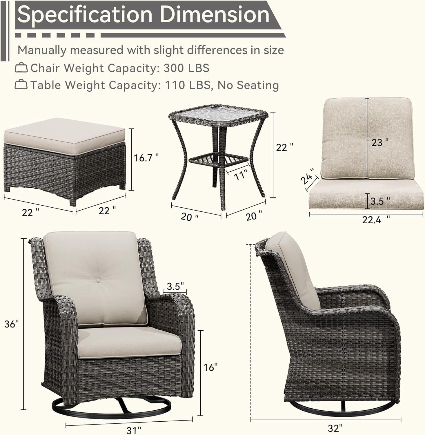 5 Piece Outdoor Patio Furniture Set Wicker Conversation Set Swivel Rocking Chairs with Side Table and Ottomans for Backyard, Porch, Deck, Beige
