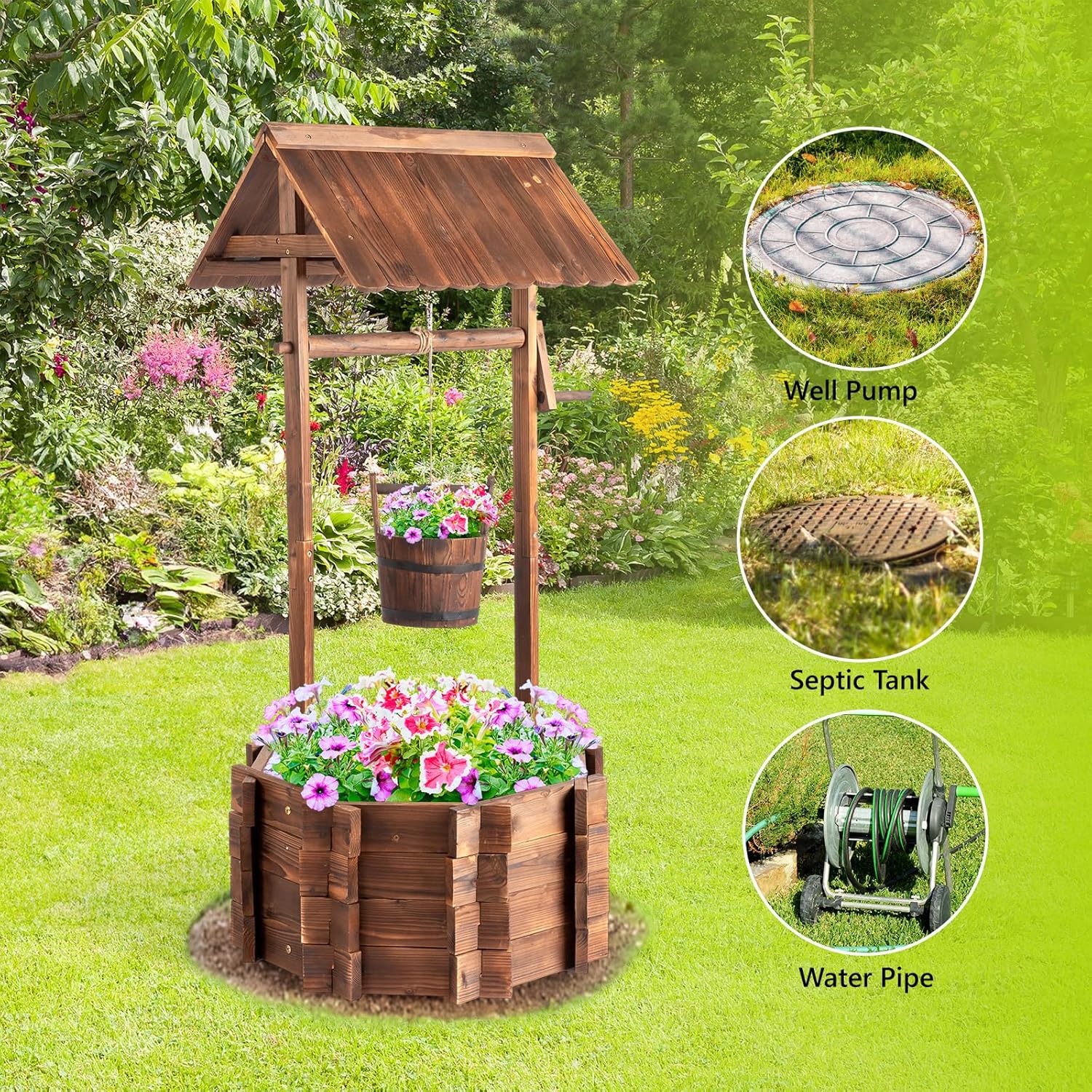 VINGLI Wooden Wishing Well Outdoor Planters, Well Covers for Yard with 2 Reinforced Rods, Height Adjustable Hanging Bucket, Rustic Flower Pot Home Decor for Outside Patio Garden