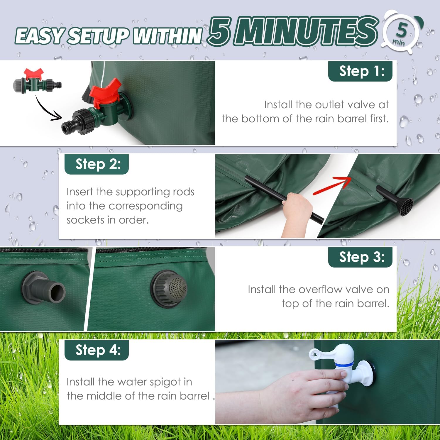 - Collapsible Rain Barrel The foldable design of portable water storage tank makes it very convenient for you to carry or store. You can place it in the garage or tool room to save you more space when not use. Whenever you need it again, it can be installed within minutes. An environmental friendly and sustainable alternative for you!