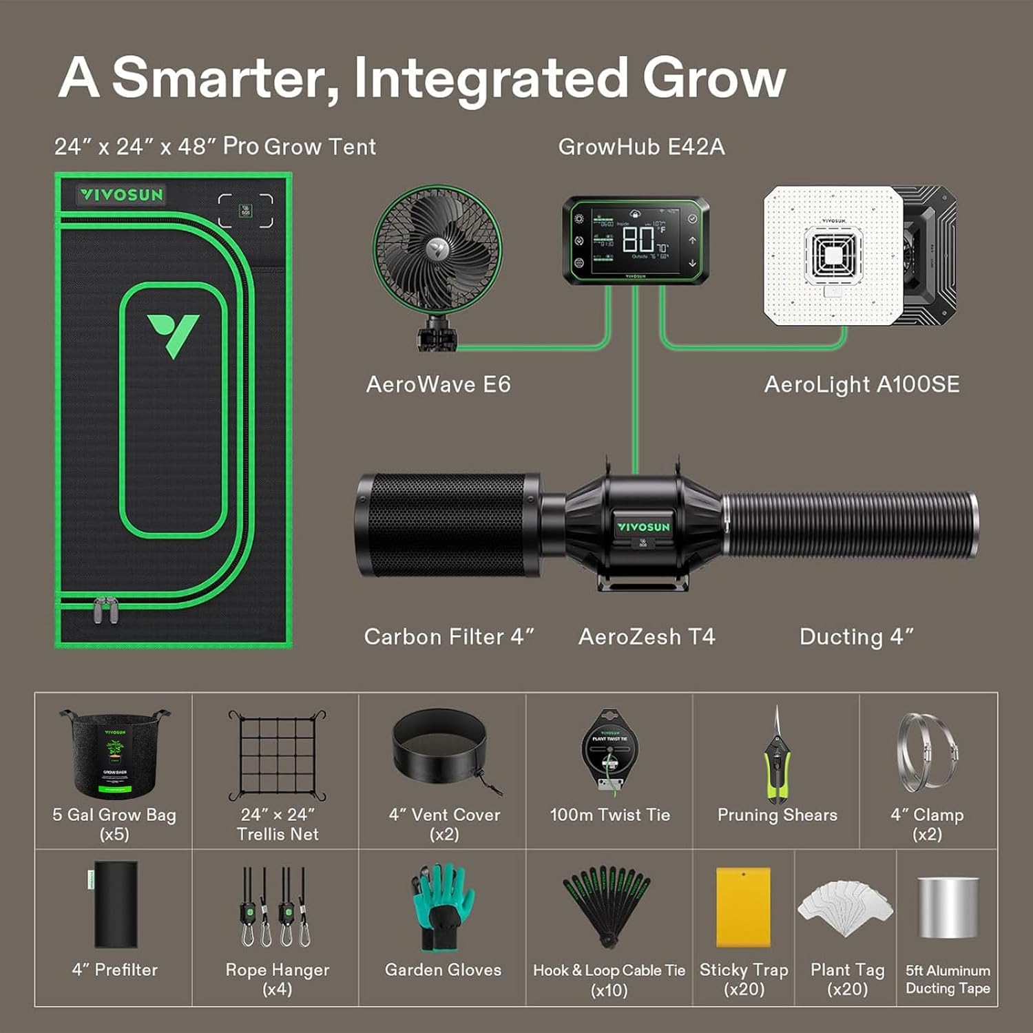 - Complete Plus Kit Included: 24"x24"x48" PRO Grow Tent; AeroLight A100SE 100W LED Grow Light; AeroZesh T4 4" Duct Fan; AeroWave E6 Clip Fan; GrowHub E42A Controller; 4" Carbon Filter; 4" Prefilter; 4" 8ft Ducting; 4" Clamp×2; 24”×24” Trellis Net; 5 Gal Grow Bag×5; 4" Vent Cover×2; Pruning Shears; 100m Twist Tie; Sticky Trap×20; Plant Tag×20; Hook & Loop Cable Tie×10; 5ft Aluminum Ducting Tape; Garden Gloves; Rope Hanger×4
