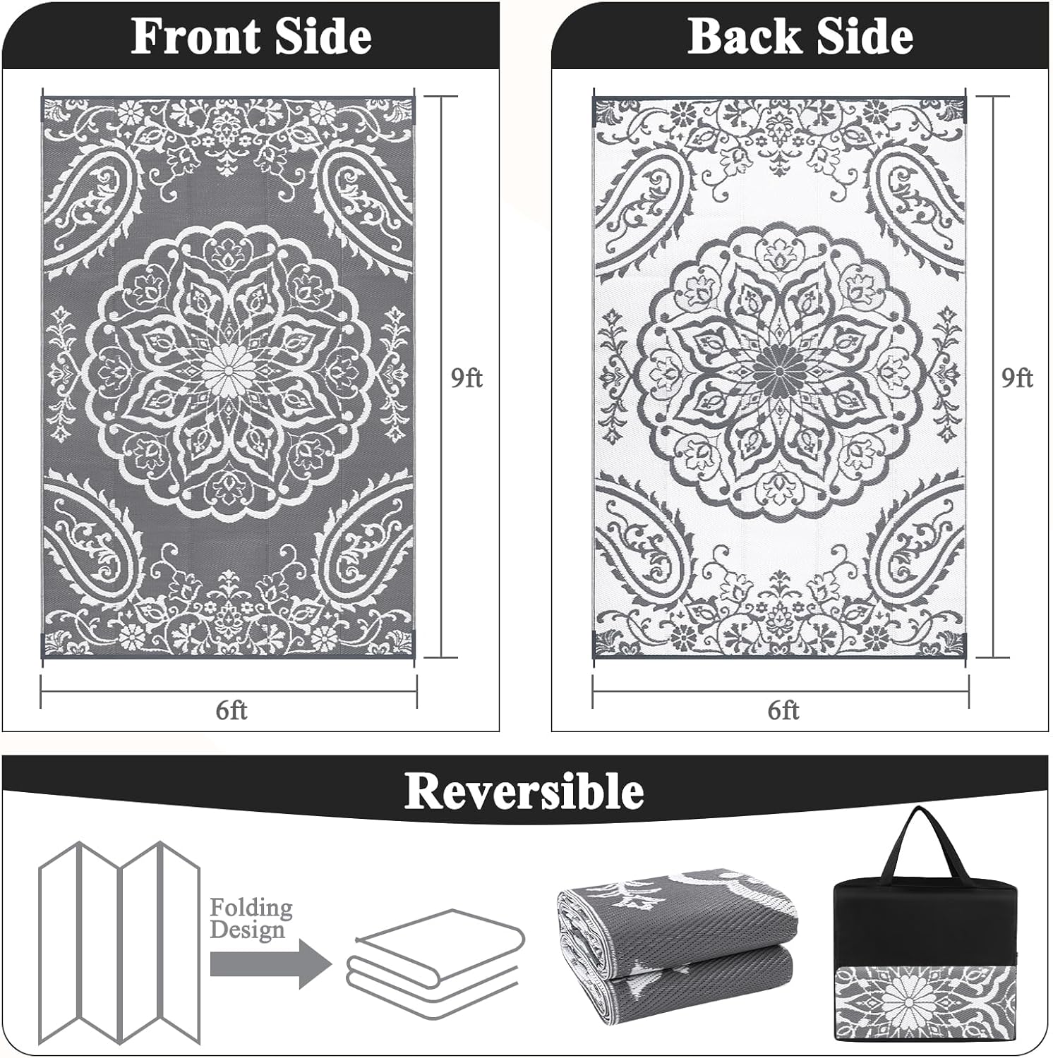 Pauwer Waterproof Outdoor Rug 6x9, Reversible Plastic Straw Patio Camping Rug, Indoor Outdoor RV Mat Carpet for Deck, Camper, Porch, Balcony, Backyard, Picnic, Boho Grey