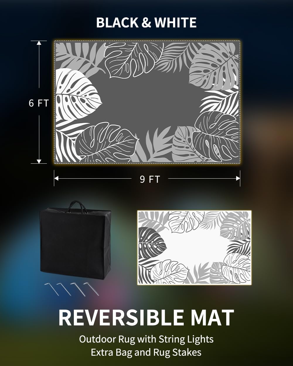 - RV traval&Camping: This camper must haves outdoor rug is ideal for picnics, gatherings, and RV trips! The lightweight outdoor camping carpet with foldable lines is easy to carry and saves space. Includes an extra carry bag and rug stakes for 6x9 ft, 8x10 ft and 9x12 ft. Grass-friendly, durable, and easy to clean, this outdoor rug enhances outdoor adventures.