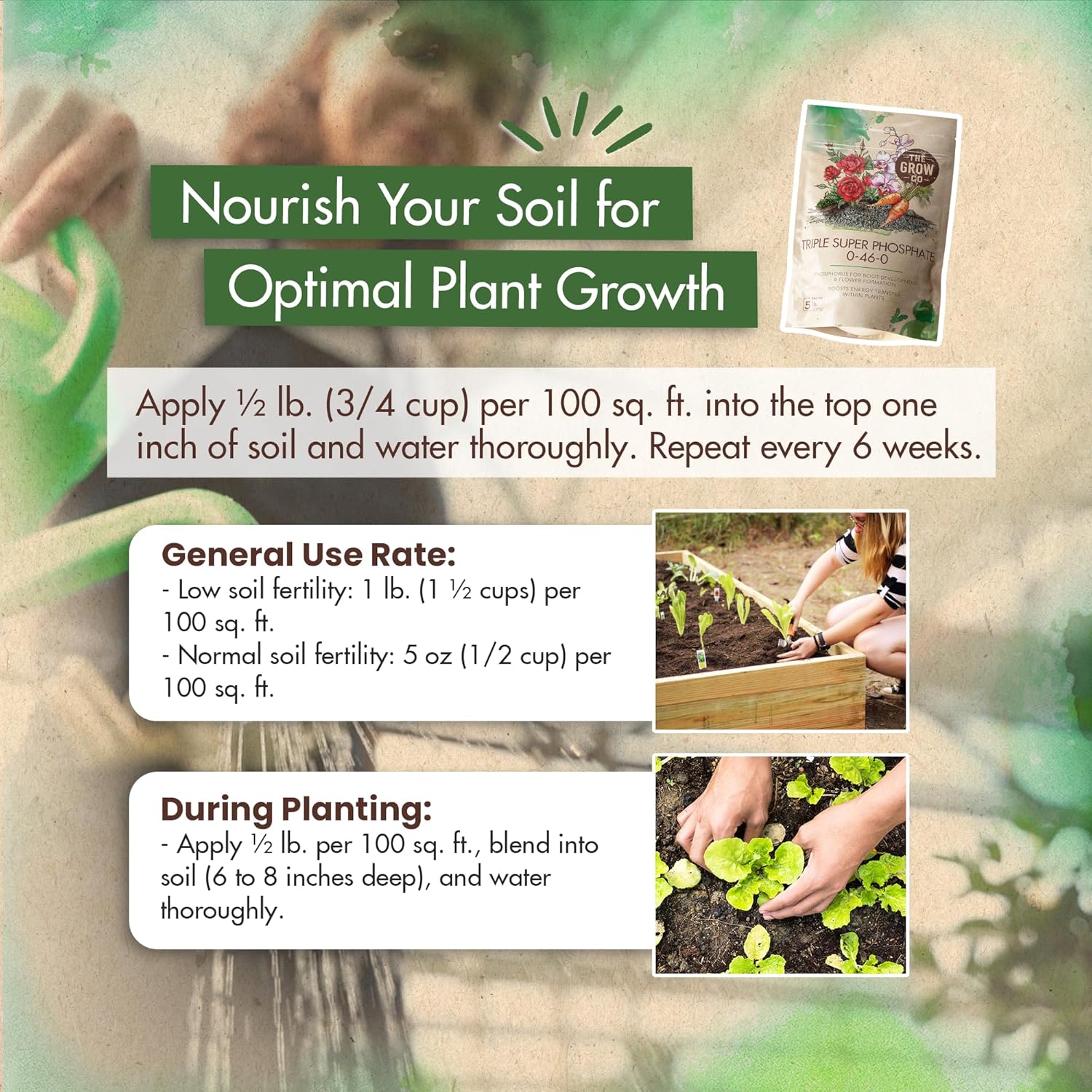 - EASY TO USE: Apply 1/2 lb. (3/4 cup) per 100 sq. ft. into the top one inch of soil and water plants thoroughly. Repeat every 6 weeks for enhanced growth, prolific flowering, and successful gardening.