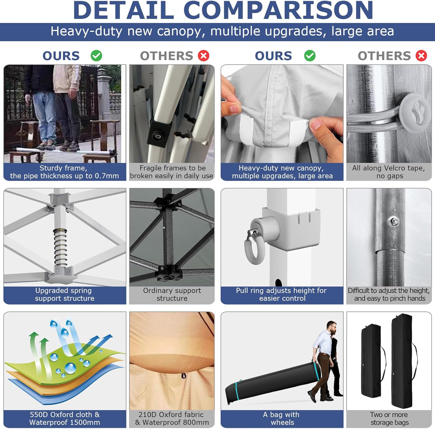 - 【Heavy Duty Steel Frame】After testing, the frame of 13x26 pop up canopy can withstand the weight of at least 9 adults. The thickness of the legs of the upgrade frame reaches 0.6mm, and the top pipe is upgraded to 0.7mm, which provides superior stability and durability. Using the included sandbags, ropes and nails, the outdoor canopy can withstand the wind speed of 30 miles/h.