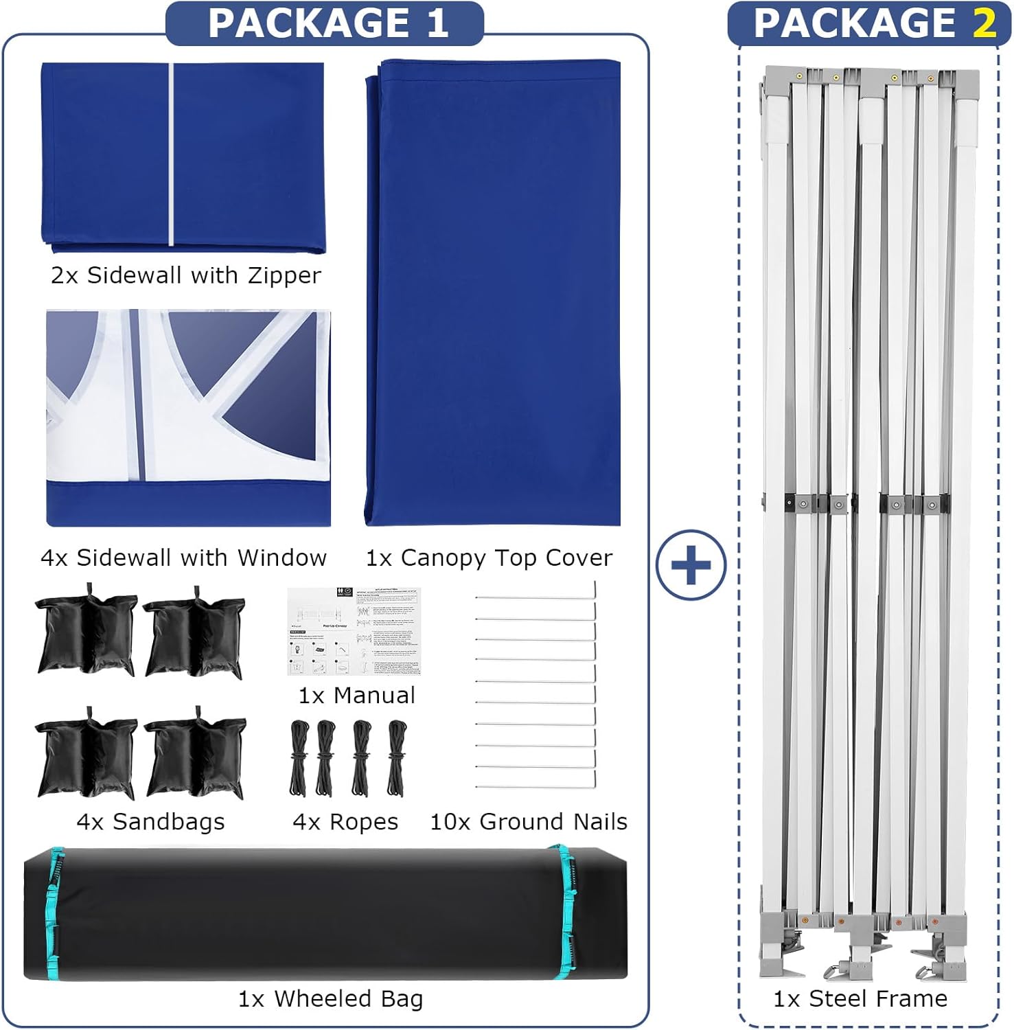 - 【What Will You Get】1x 13x26 Commercial Pop-up Canopy Frame, 1x 13x26 Canopy Top Cover, 6x PU coated SideWalls(4x SideWalls with Window and 2x SideWalls with Zipper), 4x Sandbags, 10x Ground Nails, 4x Ropes, 1x Wheeled Bag, 1x Manual. NOTE:We will divide the frame and other things into two boxes to ship. If you have any problems and questions, please feel free to contact us, we will give you the best service.