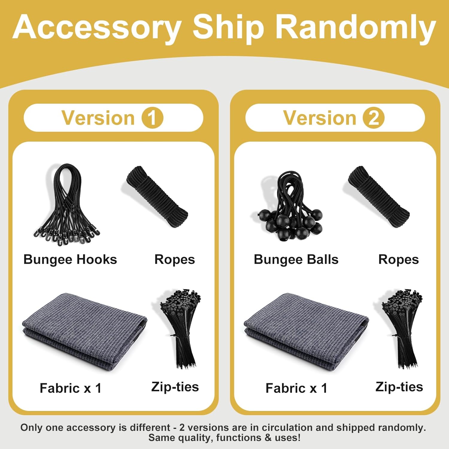 - Accessory Updated: Accessories have been updated from [Zip-ties, Ropes, Bungee Balls] to [Zip-ties, Ropes, Bungee Hooks]. Both versions are in circulation and will be shipped randomly. Easy to Install: With included grommets on each sides every 2 ft space and fixing accessories, you can easily attach the pergola shade cover to various structures while ensuring uniform stress. Whether you're looking to cover your backyard, carport, or playground, you can have it up and providing shade in no time