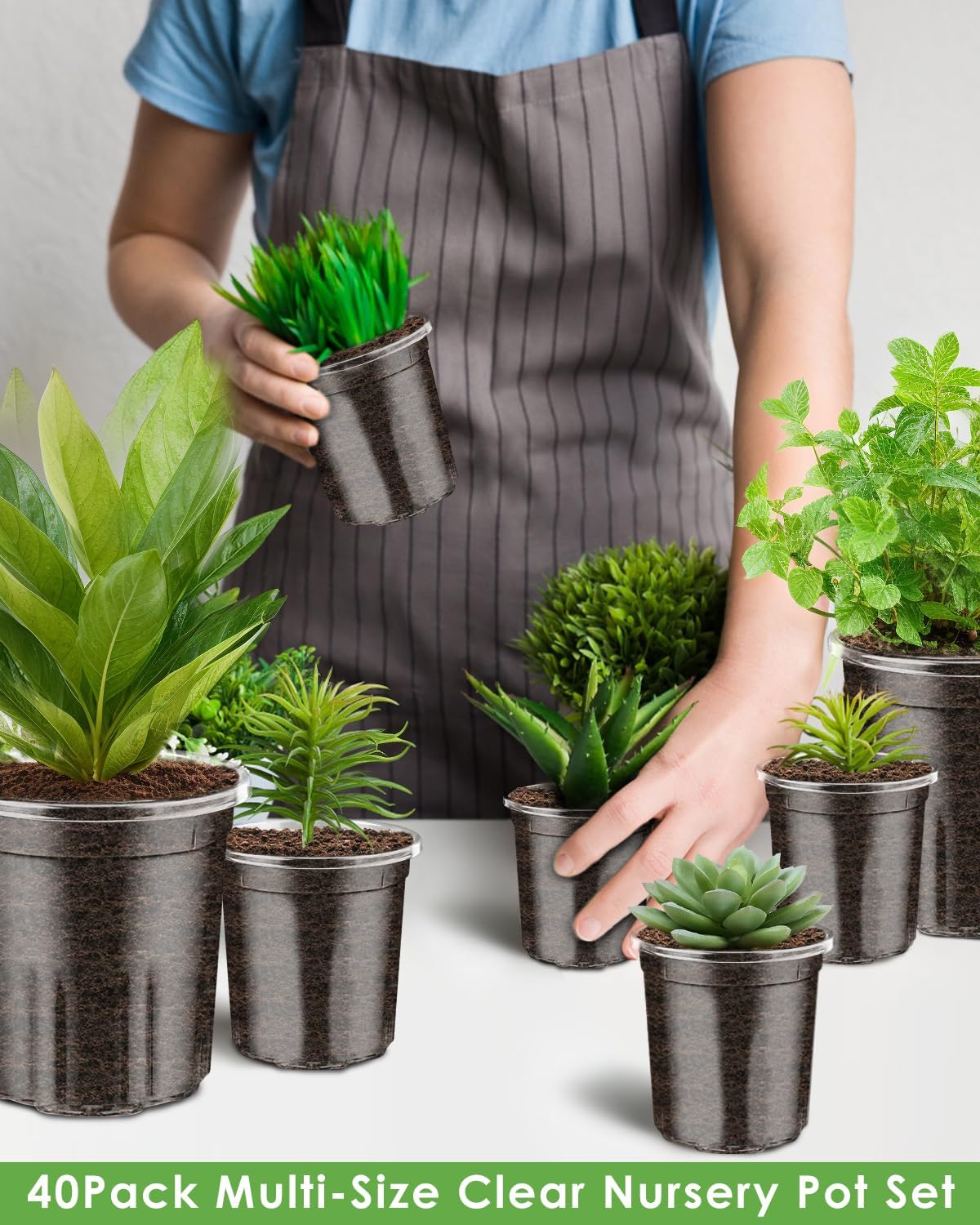 - 40Pack Clear Nursery Pots-The clear multi-size nursery pot set includes 40 pots in four sizes: 12pcs 3.5-inch, 12pcs 4-inch, 12pcs 5-inch, and 4pcs 6.5-inch. It offers the right pot for different plant types and sizes!