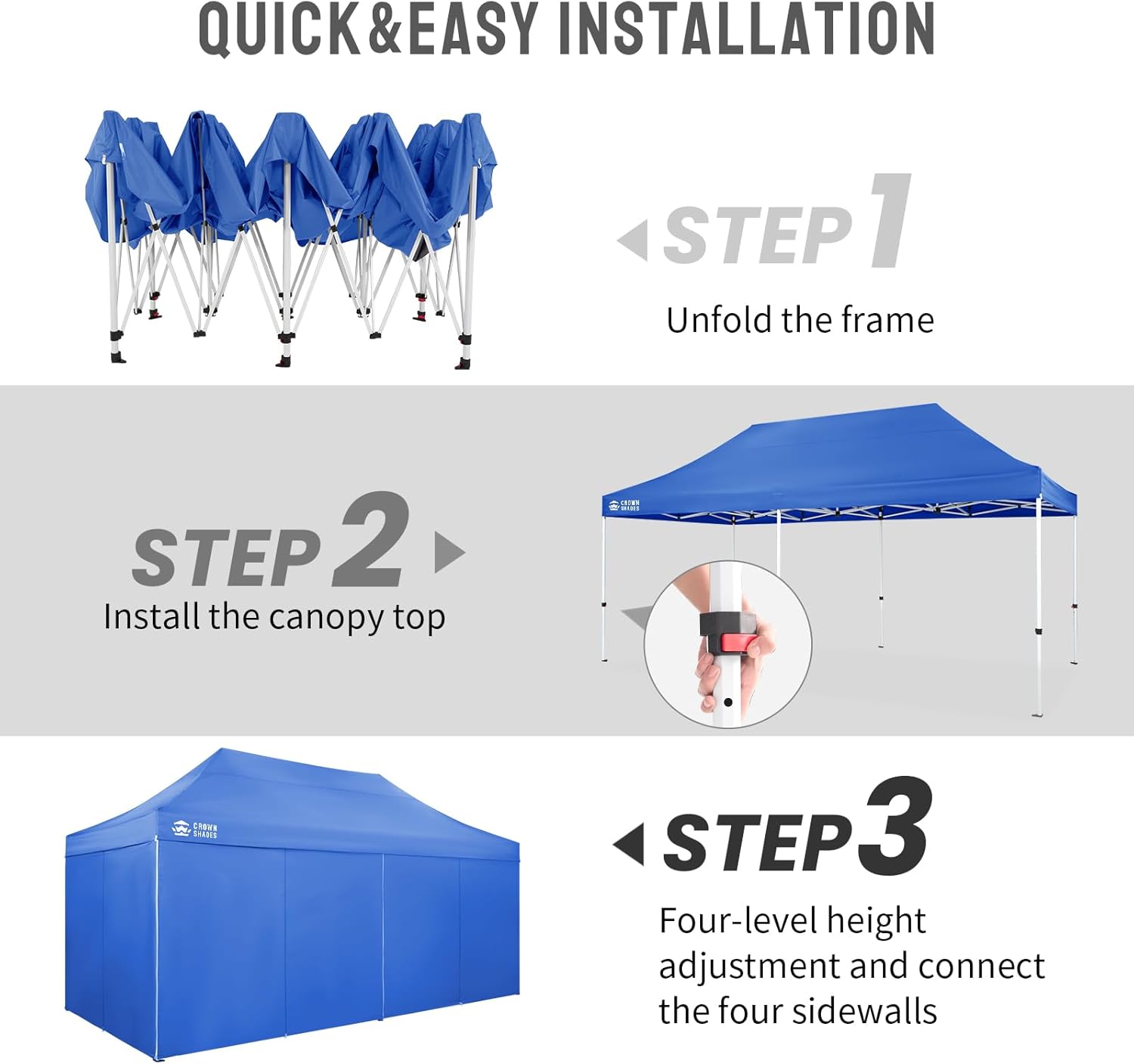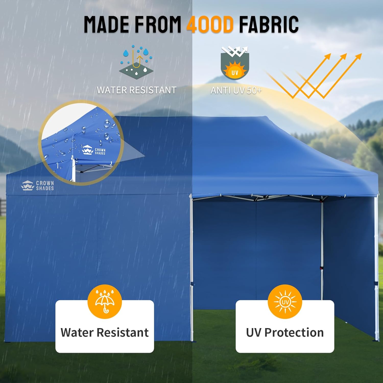CROWN SHADES 10x20 Pop Up Canopy Tent, Thicken Frame Commercial Heavy Duty Tent, 4 Sidewalls 8 Stakes & 4 Sandbags & 4 Ropes, Outdoor Canopies for Events, Parties, Blue