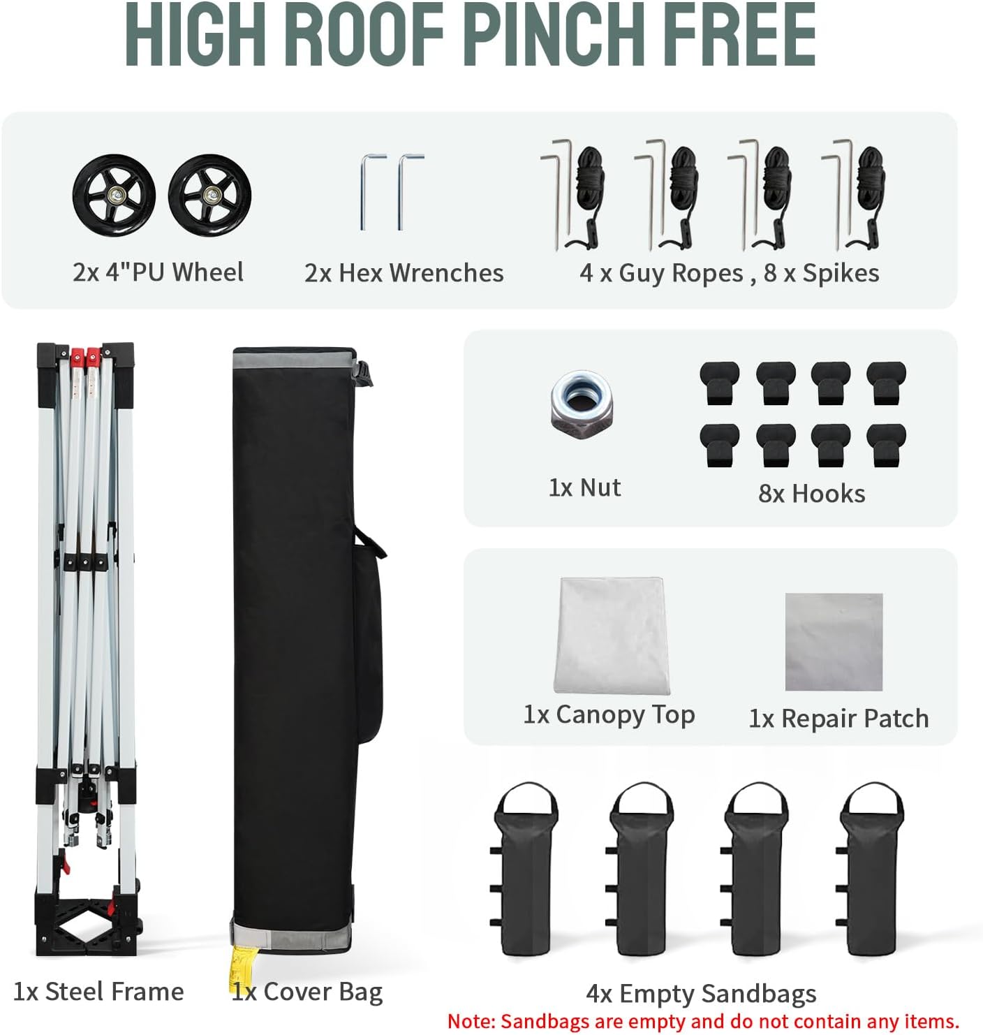 - DURABLE AND STRUDY FRAME - The canopy with sidewalls has been upgraded with a metal frame and leg tubes that are 1.2 times larger in cross-sectional area compared to other outdoor canopy, ensuring stability and durability. Equipped with 4 sandbags, it can withstand strong winds. The legs can be adjusted to 4 different heights using pinch-free buttons, and 8 hooks are included for hanging lights, signs, and more, suitable for commercial and professional events such as business activities.