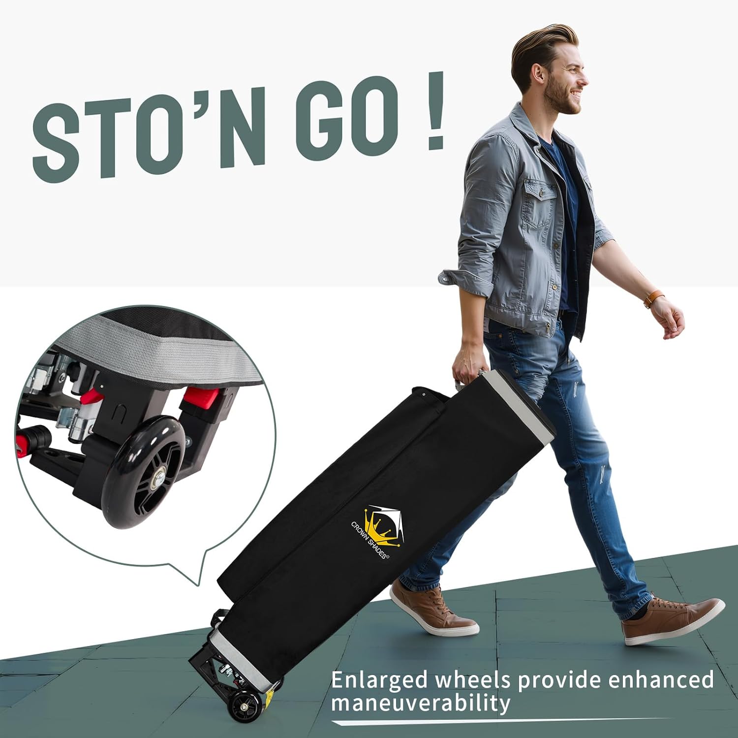 - Sto 'N Go Cover Bag - Exclusively, the bottom of the two leg tubes is equipped with 4" oversized wheels (simple assembly required for first use), allowing the 10x10 canopy to be moved directly while open, a valuable addition to any outdoor activity. A patented Sto 'N Go Cover Bag is included, which, when folded, still exposes the wheels at the bottom of the leg tubes for easy movement without wearing out the bag.
