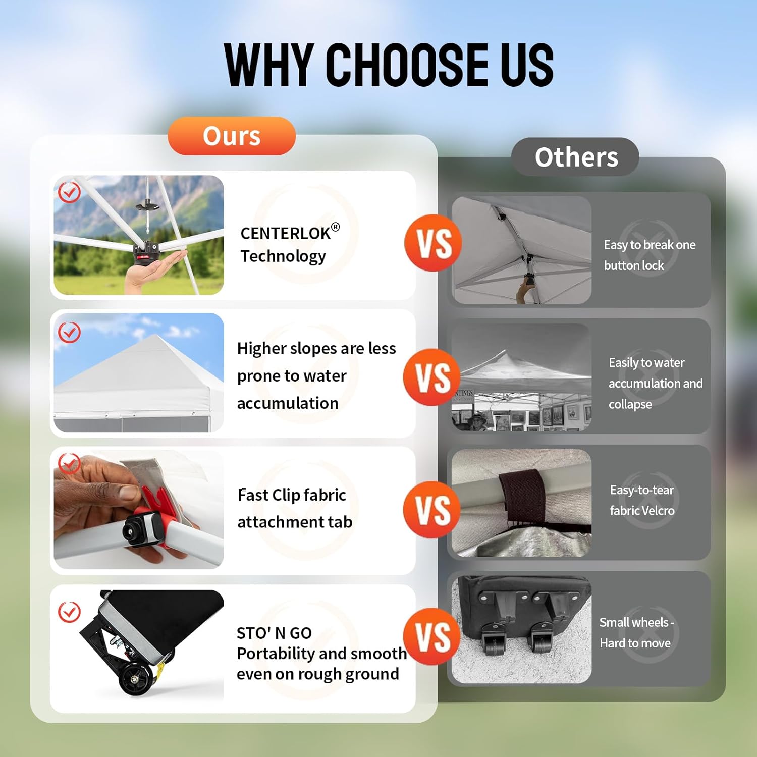 - PRIVACY AND PROTECTION- Four detachable side walls offer privacy and protection from wind and dust, ensuring shade and the security of your products. An easy-clip tech is utilized to secure the top cover and prevent the accumulation of water. The top cover fabric is made of 400D polyester with a coating, offering UPF 50+ UV protection, blocking 98% of UV rays, and meeting the CPAI-84 flame retardant standard. The top vent has been omitted to prevent leaks.