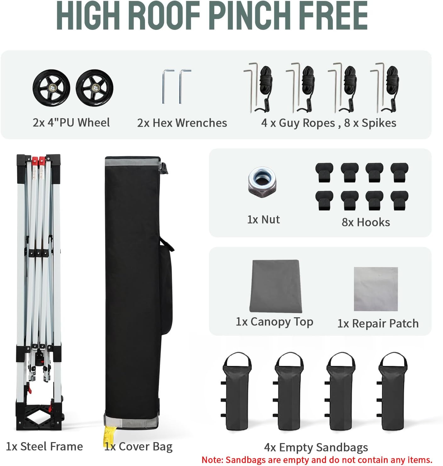 - [EASY TRANSPORT & STORAGE]: Weighing just 48.5 lbs, this canopy is designed for easy transport in your vehicle. The enlarged wheels of the Sto'N Go bag provide enhanced maneuverability, making it simple to take your canopy wherever you need shade.Comprehensive Accessories Included:8 hooks, 2 large 4" wheels, a sturdy steel frame, a cover bag, a canopy top, a repair patch, 2 hex wrenches, a nut, 4 guy ropes, 8 spikes, and 4 empty sandbags.