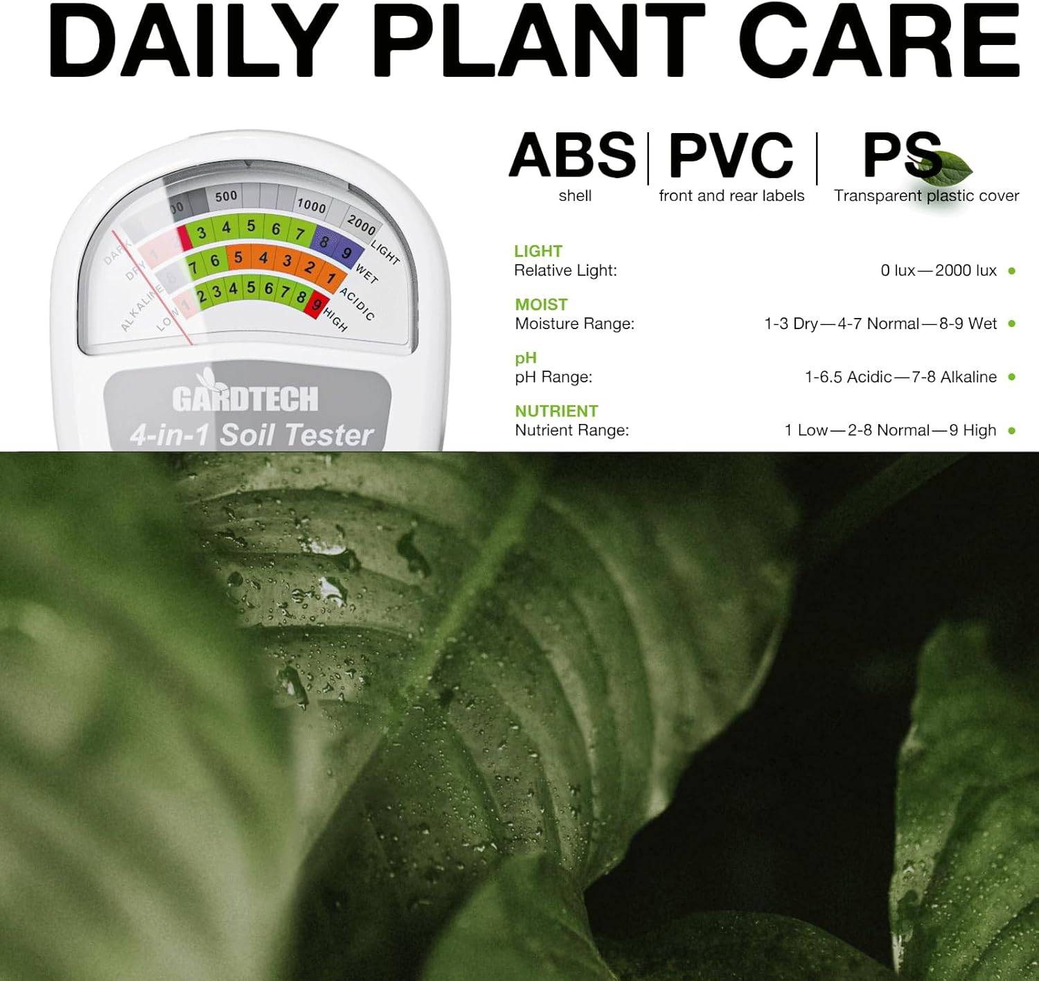 - đ»ă4-in-1 Multi-Functionă- This soil meter for plants can meet your needs to measure soil moisture, Ph, nutrients, and light conditions at the same time. The 4-in-1 soil moisture meter indoor plants is much more cost-effective than traditional single-function soil testers, and you only need to buy one to enjoy all four services. It helps you to fully understand your plants.