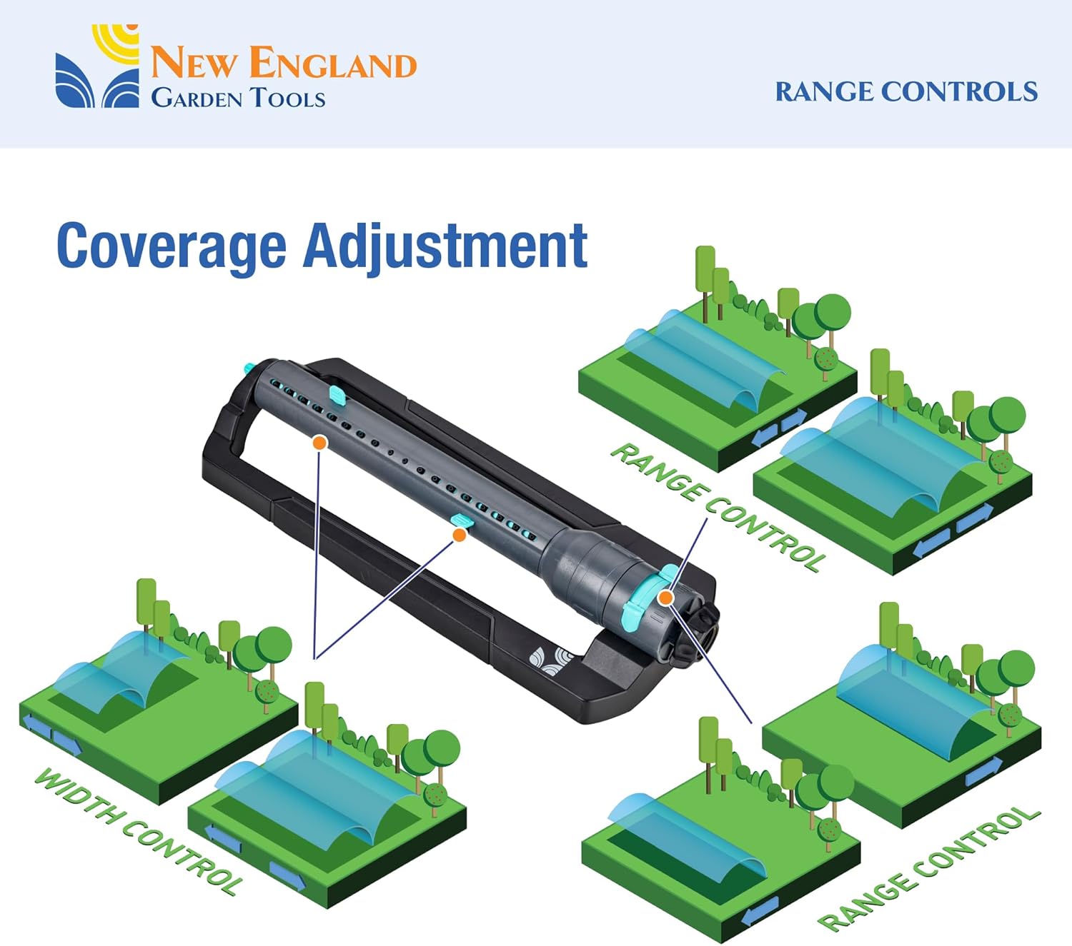 - Visible Adjustment Knobs: easy-to-use control knobs to adjust range and width to fit the target watering area