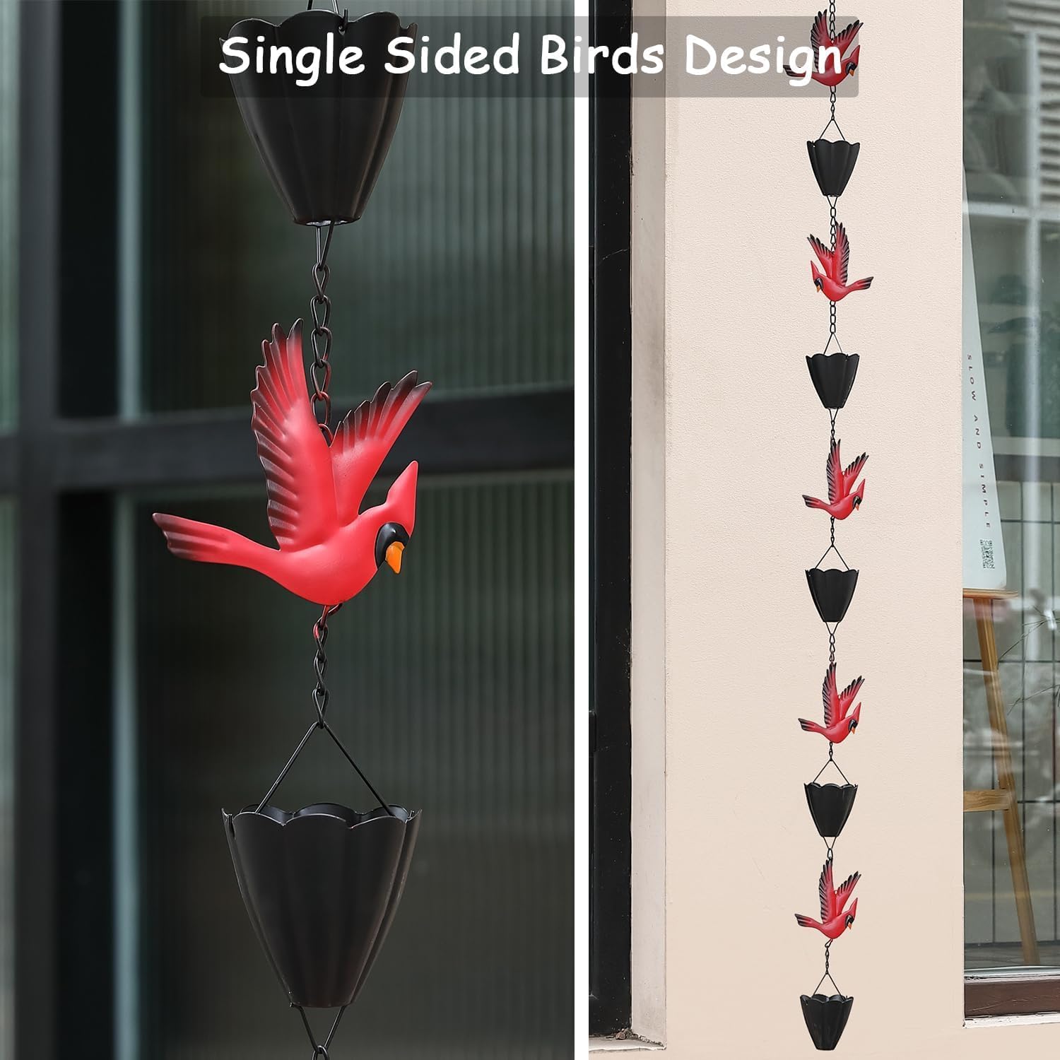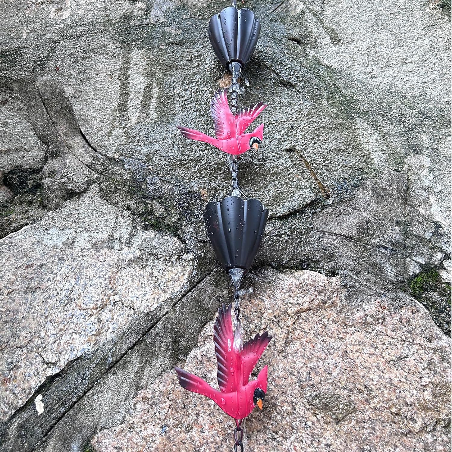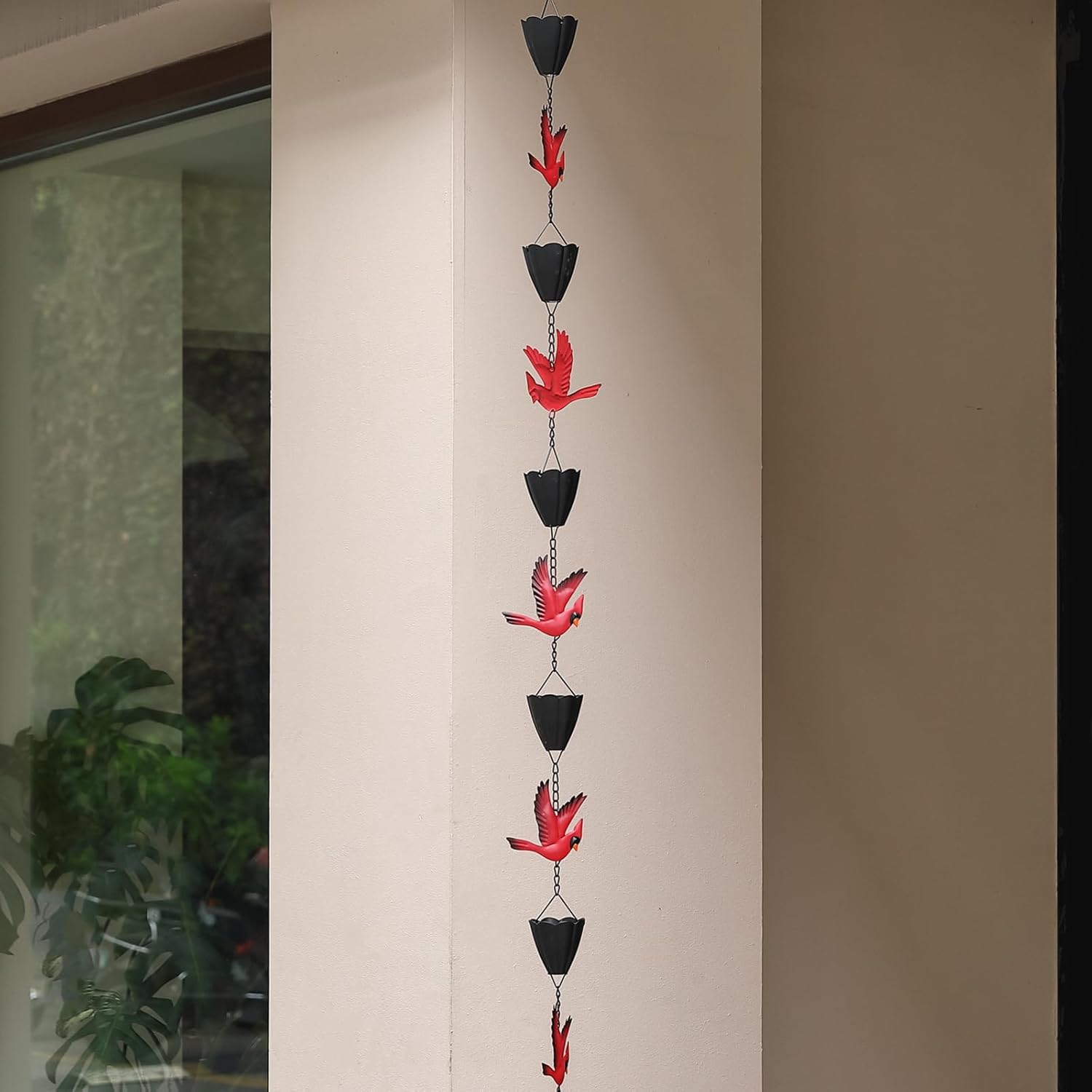 - ๐ฆ Cardinal Rain Chains: This decorative rain chain is uniquely designed and consists of 8 vivid cardinal birds and 9 vintage elegant cups. The edge of bird feathers is black, which makes them look less boring. The collision of black and red adds a touch of mock examination flavor to the whole rain gutter chain.