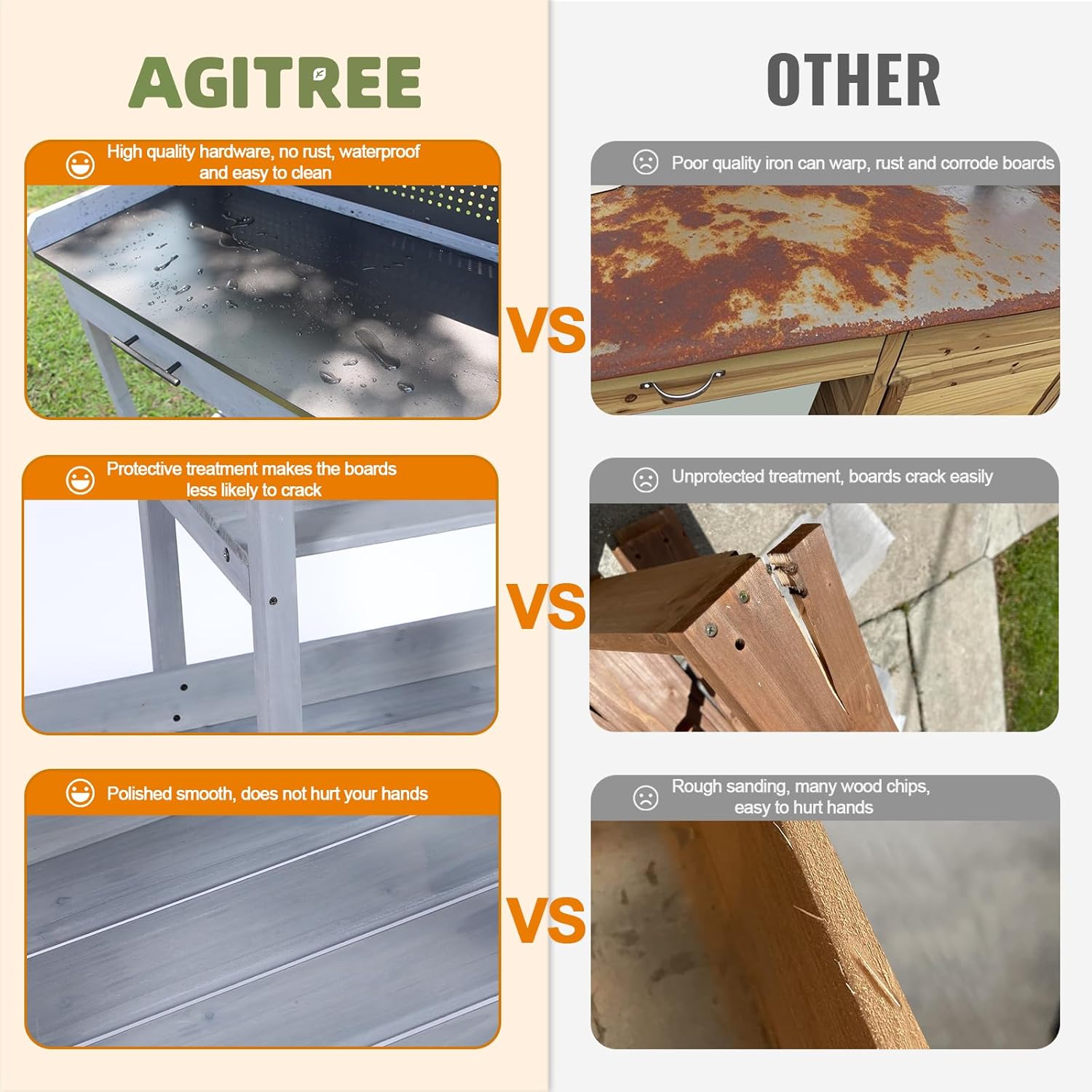 - 【Premium Natural Fir Wood】:Gardening bench for outside is specially designed for your garden The main body is 100% fir wood .garden work bench is strong enough for long-time outdoor use in any weather condition.You can use potting table as an indoor or outdoor bonsai table, or storage cabinet,allows you focus on your garden work, seedlings, potted plants, pruning, watering, and trans planting upright .garden table allows you focus on your work upright without strain or soreness caused by long-time bending over. Ideal for gardening, potting plants, and outdoor projects with a spacious work surface and storage shelves.