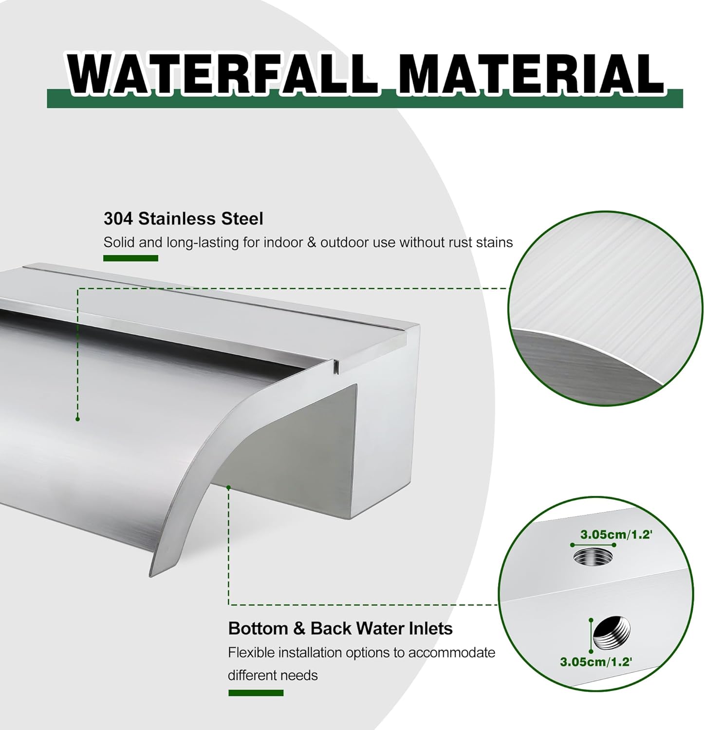 - ăAnti-Rust Spillway Waterfallă- Our welded in one body one-piece 304 stainless steel construction of this spillway waterfall provides long-lasting strength, rust resistance, and leakproof performance. The open lip design creates an elegant freefalling waterfall that adds decorative flair to ponds and pools. The soothing sound of the cascading water promotes relaxation and tranquility. LED light strips not included, but available separately.