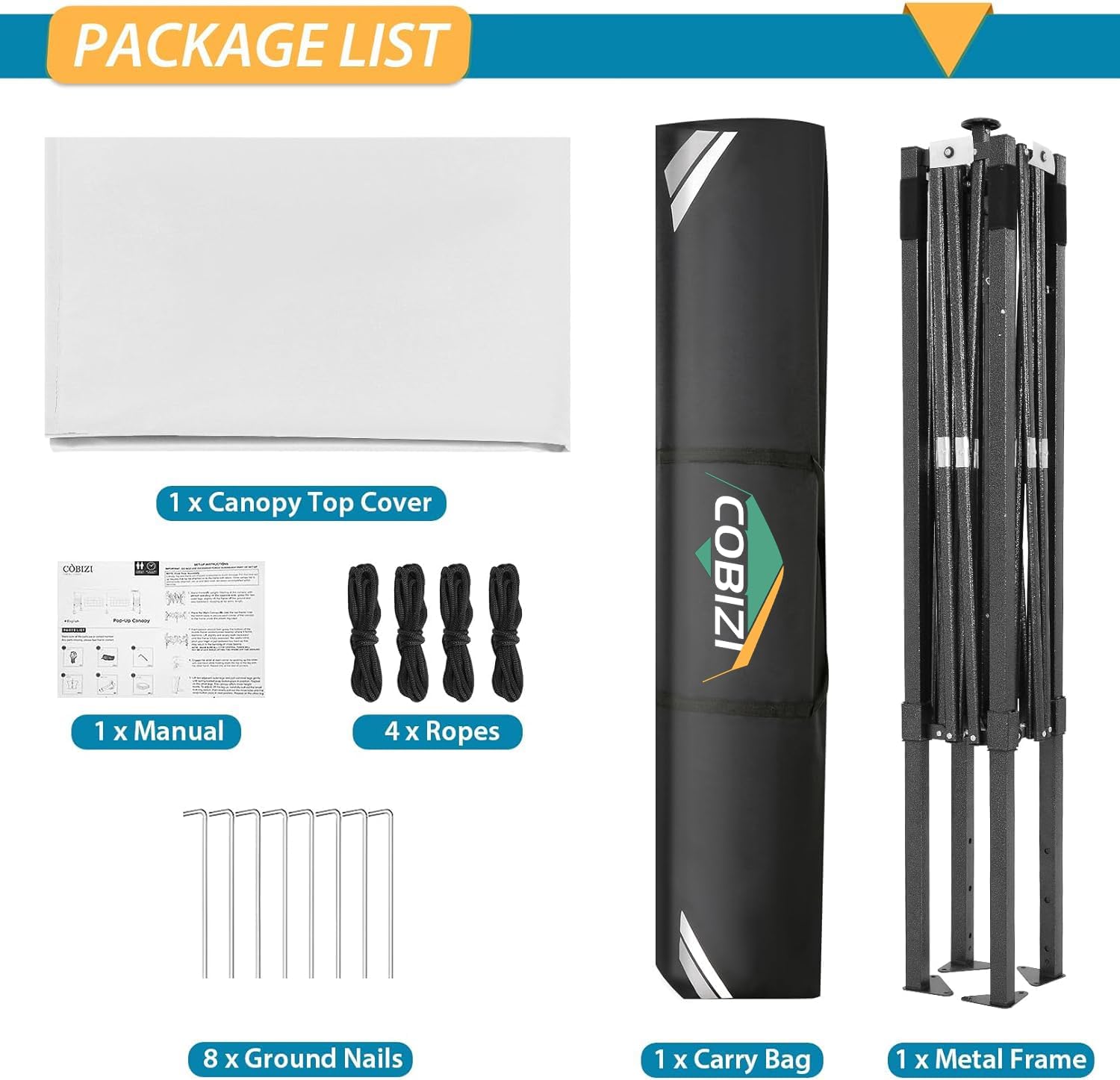 - 【43 SQ Feet Shade Area】COBIZI 6.6x6.6 pop up tent provides 43 SQFT spacious covered space, it can easily accommodate 3-5 people, meet your different needs for holding small gatherings. Perfect for wedding, birthday party, market event and other small events. When in use, always secure the 6.6x6.6 pop up tent with the included stakes and ropes to avoid damage. One year after-sale protection for canopy frame; Six months after-sale protection for fabrics and accessories.
