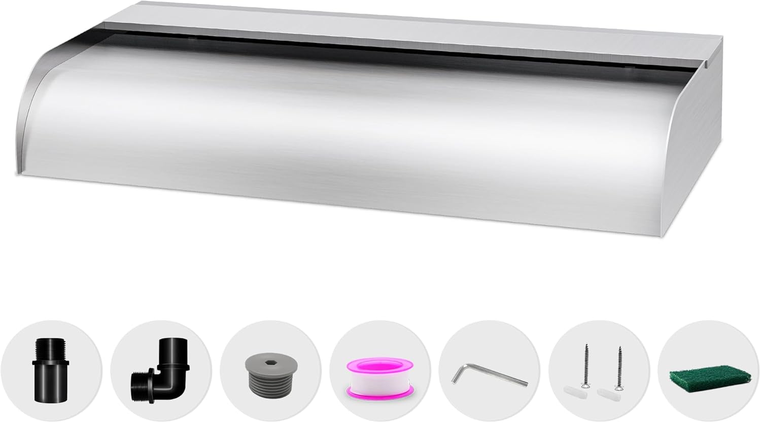 - ăAnti-Rust Spillway Waterfallă- Our welded in one body one-piece 304 stainless steel construction of this spillway waterfall provides long-lasting strength, rust resistance, and leakproof performance. The open lip design creates an elegant freefalling waterfall that adds decorative flair to ponds and pools. The soothing sound of the cascading water promotes relaxation and tranquility. LED light strips not included, but available separately.