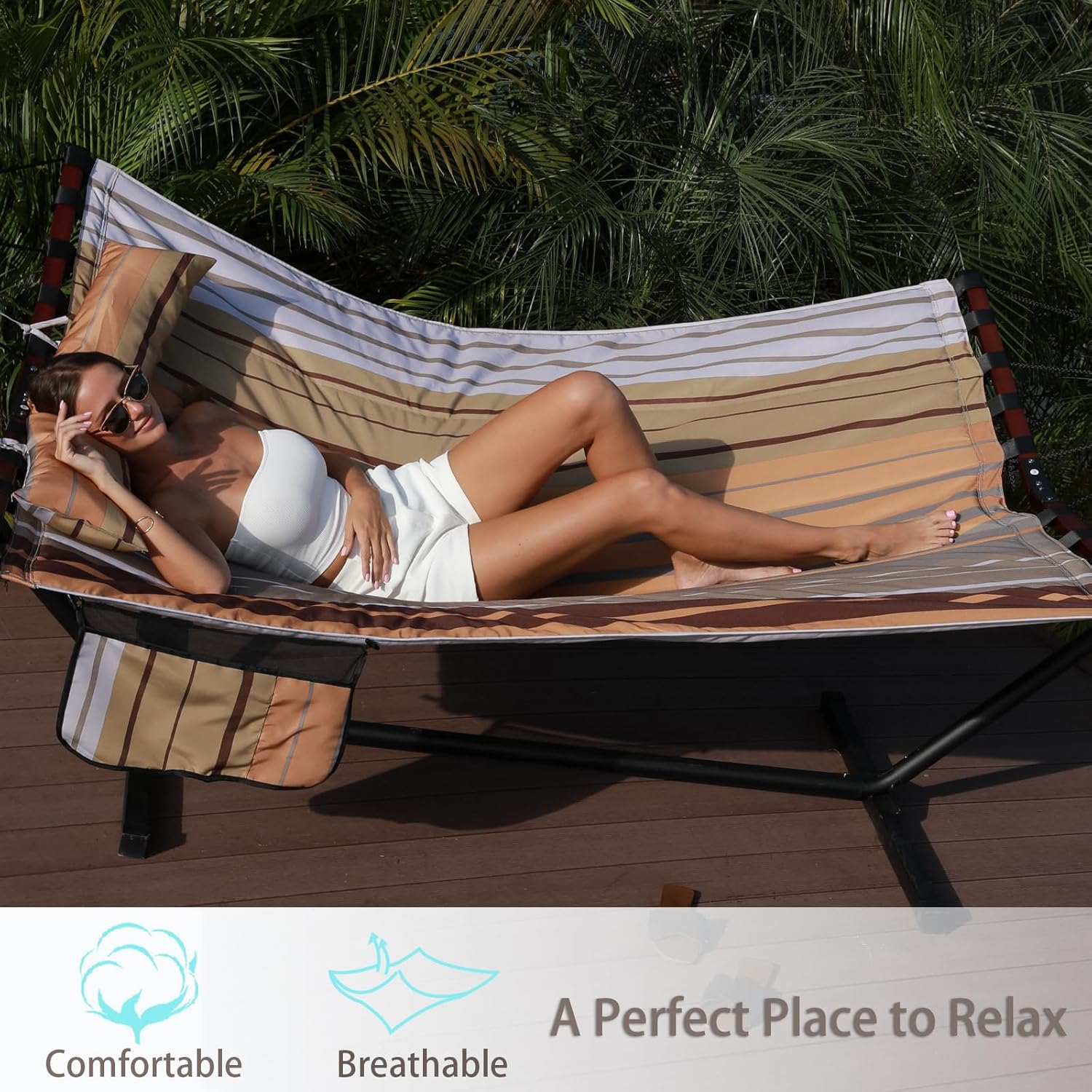 - ā Premium Weather-Resistant Polyester Fabric: Two-layer quilted fabric hammock, filled with soft padding. Resting on our hammock for a moment feel like laying on the cloud.
