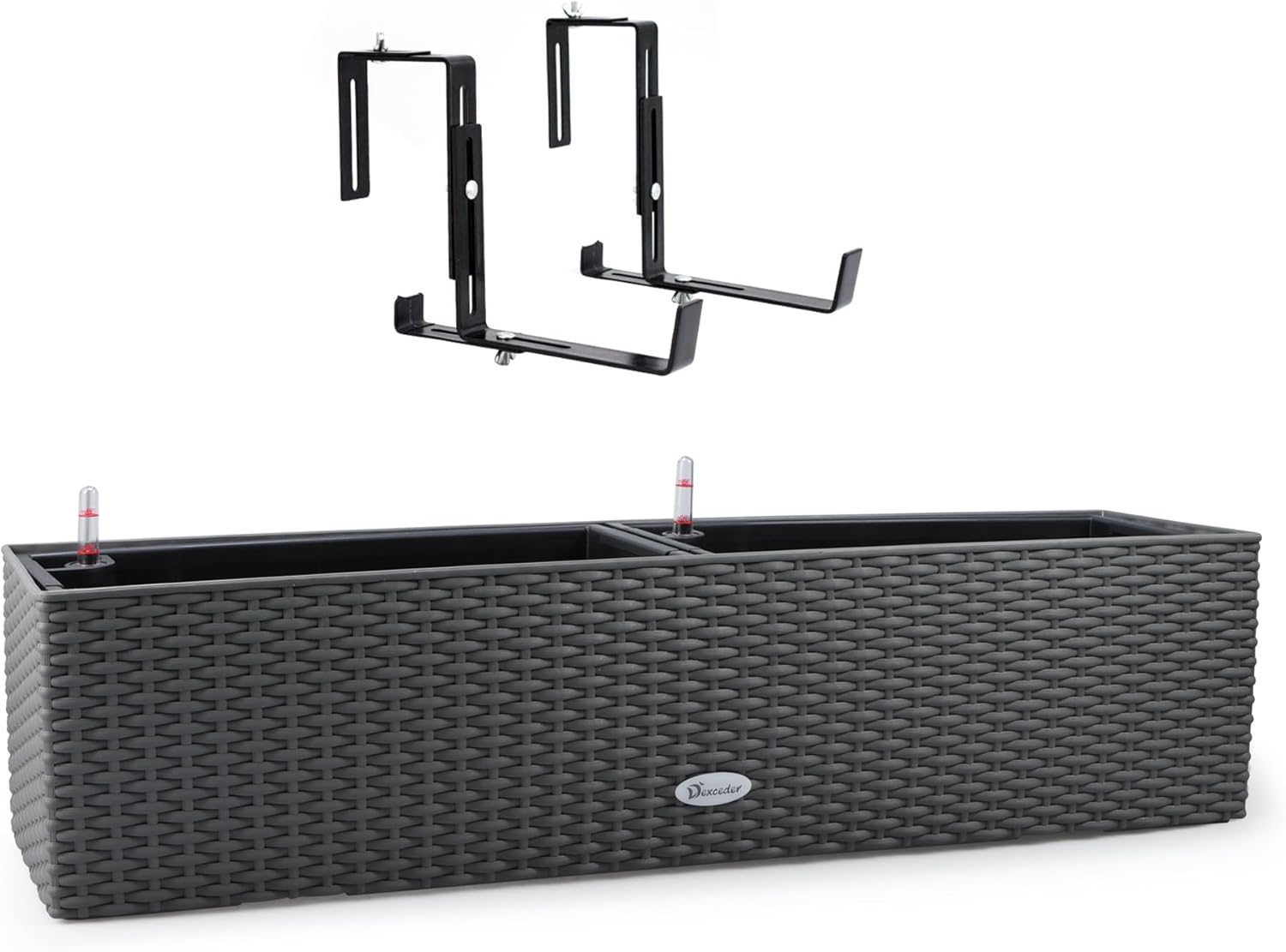 Dexceder 31.5 Inch Rattan Self Watering Planter Indoor Outdoor, Thickened Large Rail Flower Plant Pot Window Box with Water Level Indicators & Bracket (Deep Gray)