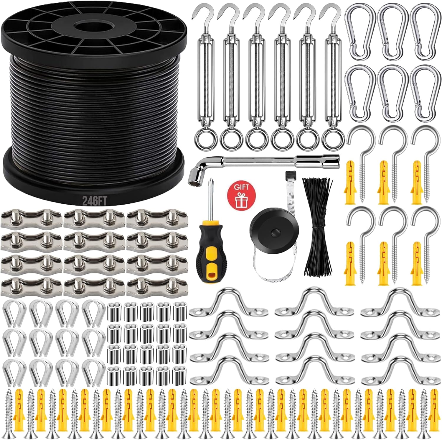 246FT Black Vinyl Coated 304 Stainless Steel Wire Rope Cable Kit – Heavy Duty Outdoor String Light Hanging Guide Wire with M5 Turnbuckle for Patio, Garden, Christmas Lights