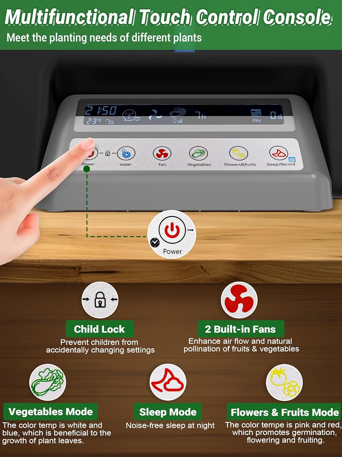 - 【Sleek Design & User-Friendly】 The Growell hydroponics growing system features a large 5.4-inch screen that provides clear and comprehensive data on your hydroponic setup, giving you full control over your plant growth. With its straightforward button settings, even beginners can operate it with ease. Plus, our child lock mode keeps curious kids from accidentally interfering with your hydroponic system settings.