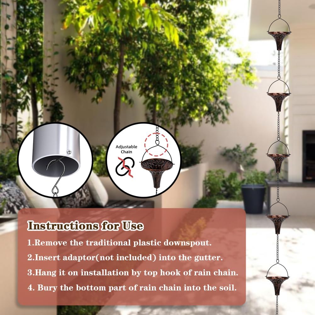 - Easy to Use: The rain catcher chain is easy to install, hang the hook on the adapter and you can use it. Decorating the eaves instantly makes your house elegant. When it rains, listening to the rain chain brings you a unique and pleasant sound, making people feel amazed