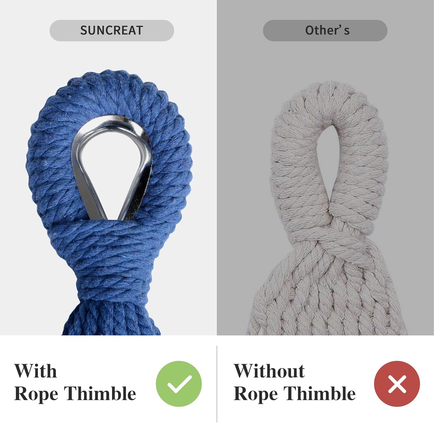 - Handcrafted Ropes: The metal rope thimble is effective for preventing the long-term friction between the tree strap and the ropes, thus prolong the service life of the hammock. The 18 ropes at both ends of the hammock are made of poly-cotton, tightly braided and fixed, which greatly increase the load bearing capacity
