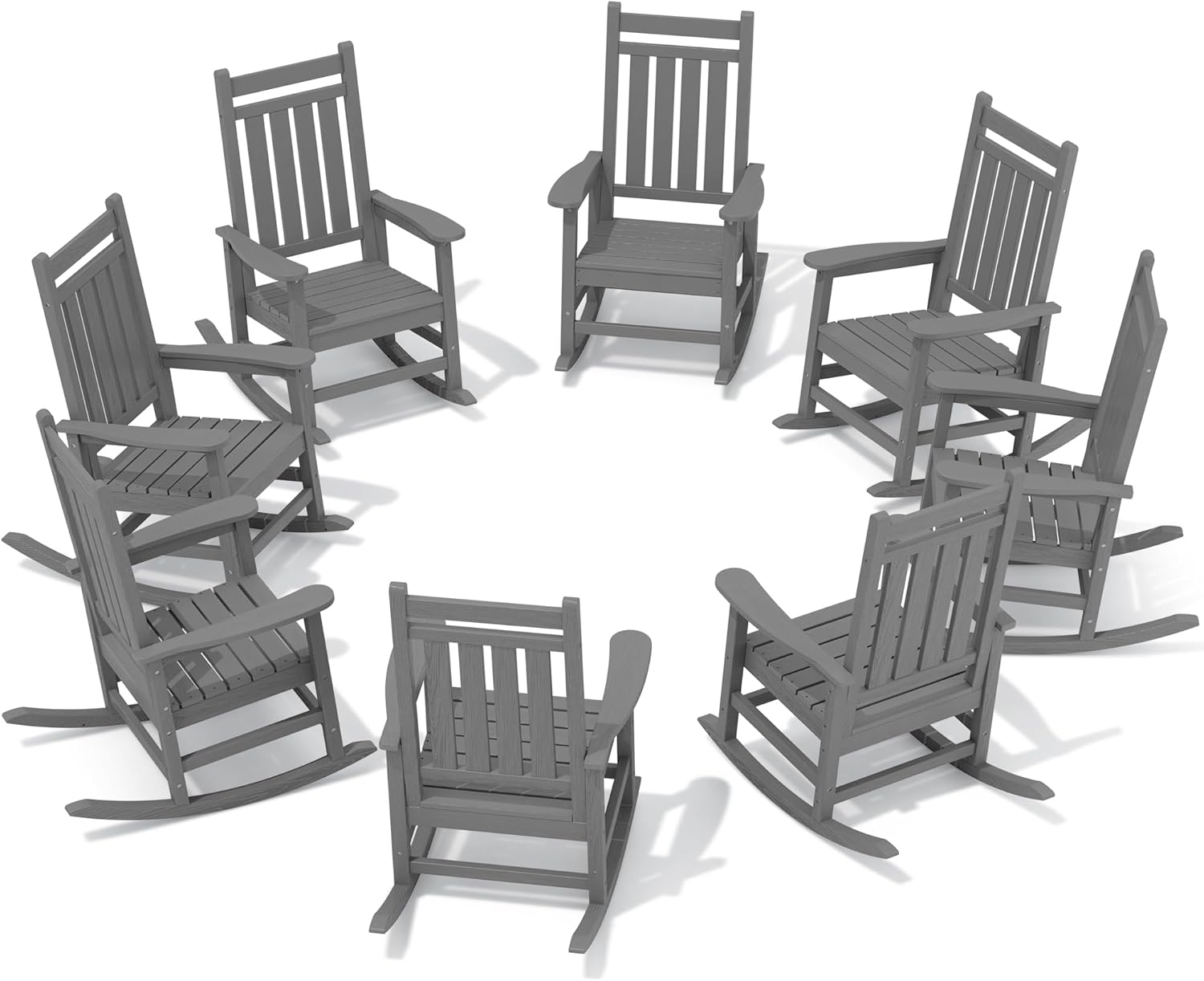 SERWALL HDPE Outdoor Rocking Chair Set of 8, Patio Rocking Chairs for Adults, All Weather Outdoor Rockers for Lawn, Grey
