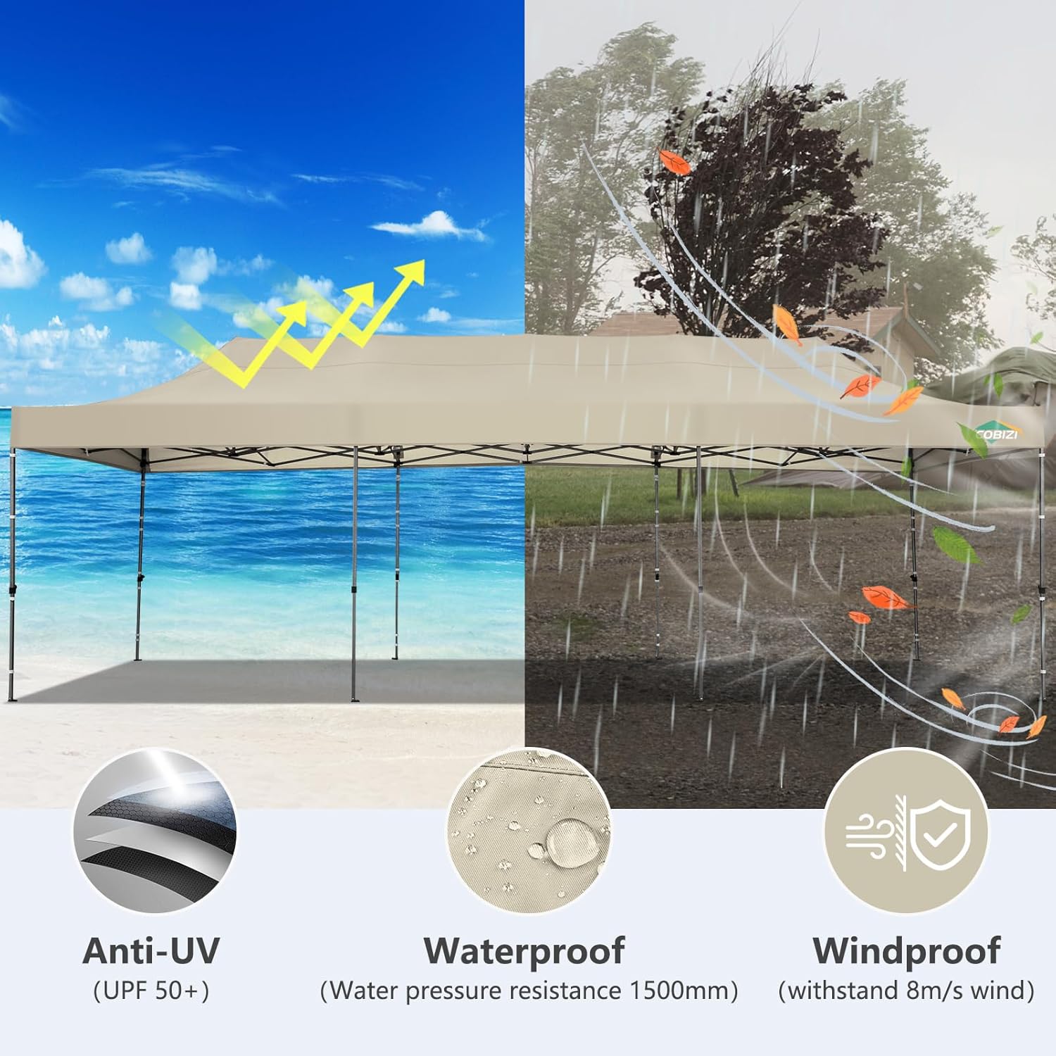 COBIZI 10x30 Pop up Canopy, Heavy Duty Outdoor Party Tents for Parties, Ez up UPF 50+ Waterproof Commercial Canopy with Wheeled Bag can fold, Khaki(Windproof Upgraded)