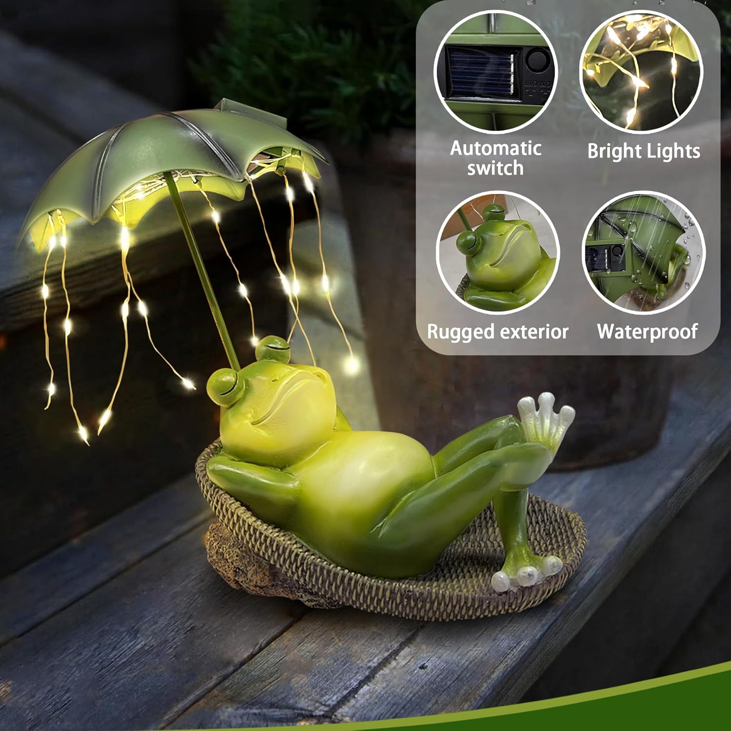 - Solar Garden Frog: Frog resin statue lights are a combination of animal elements and solar light. The cute frog blends in with the natural outdoor scenery, creating a relaxing, cute and pleasant atmosphere for your garden.