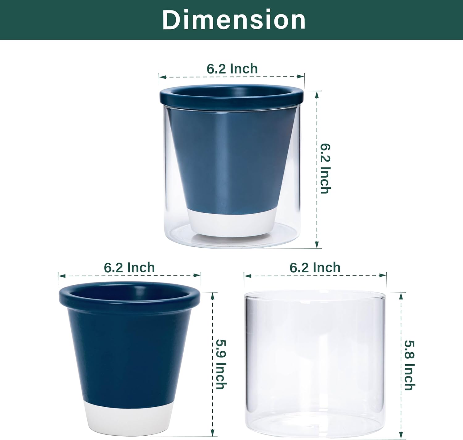 D'vine Dev 6 Inch Design Self Watering Planter for Indoor Plants, Blue Terracotta Pot with Cylinder Glass Cup, Set of 2, 37-Y-B-4