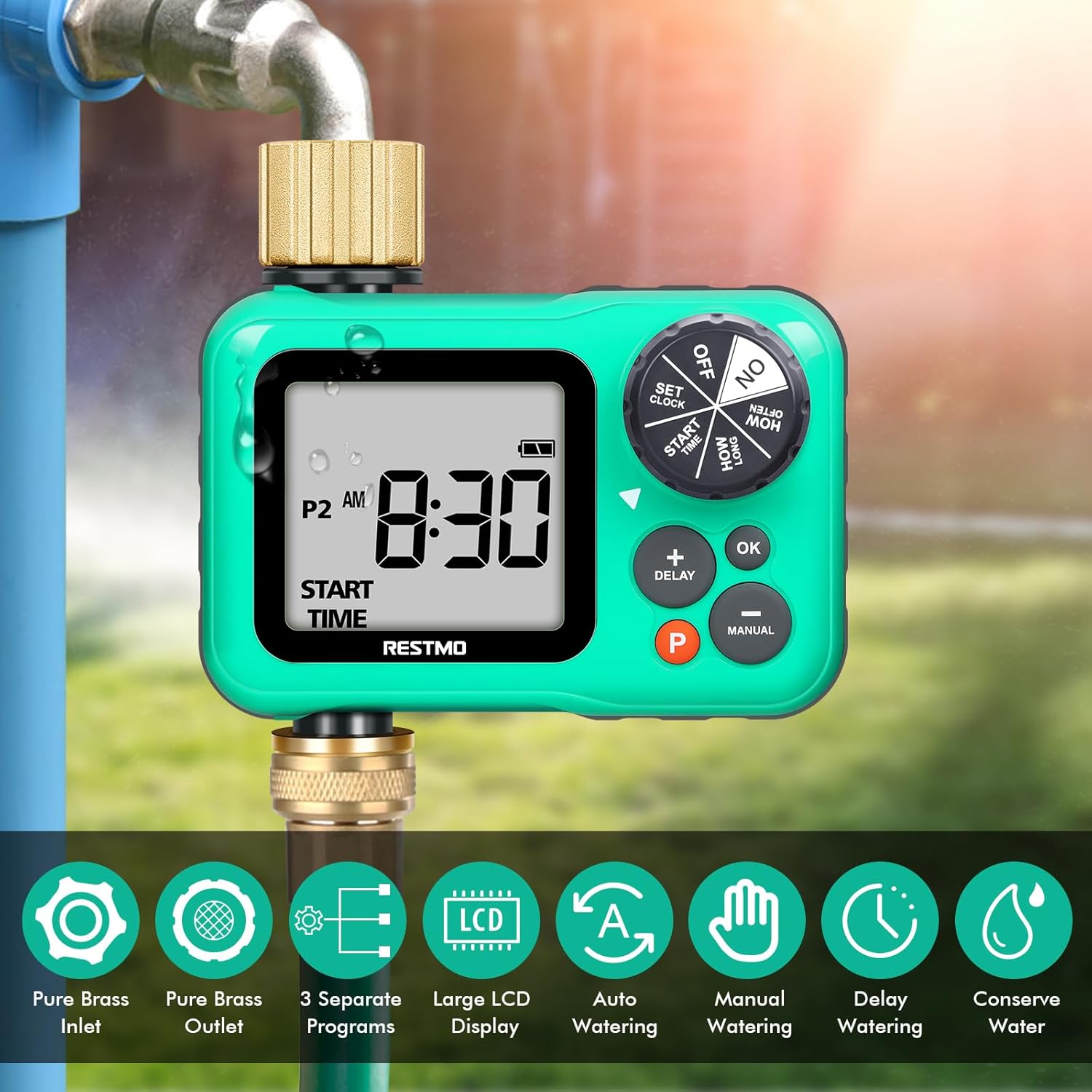 RESTMO Sprinkler Timer with Brass Inlet & Outlet, 3 Separate Programs Hose Timer, Programmable Water Timer for Garden Hose, Manual | Rain Delay | Automatic Watering System for Drip Irrigation and Lawn