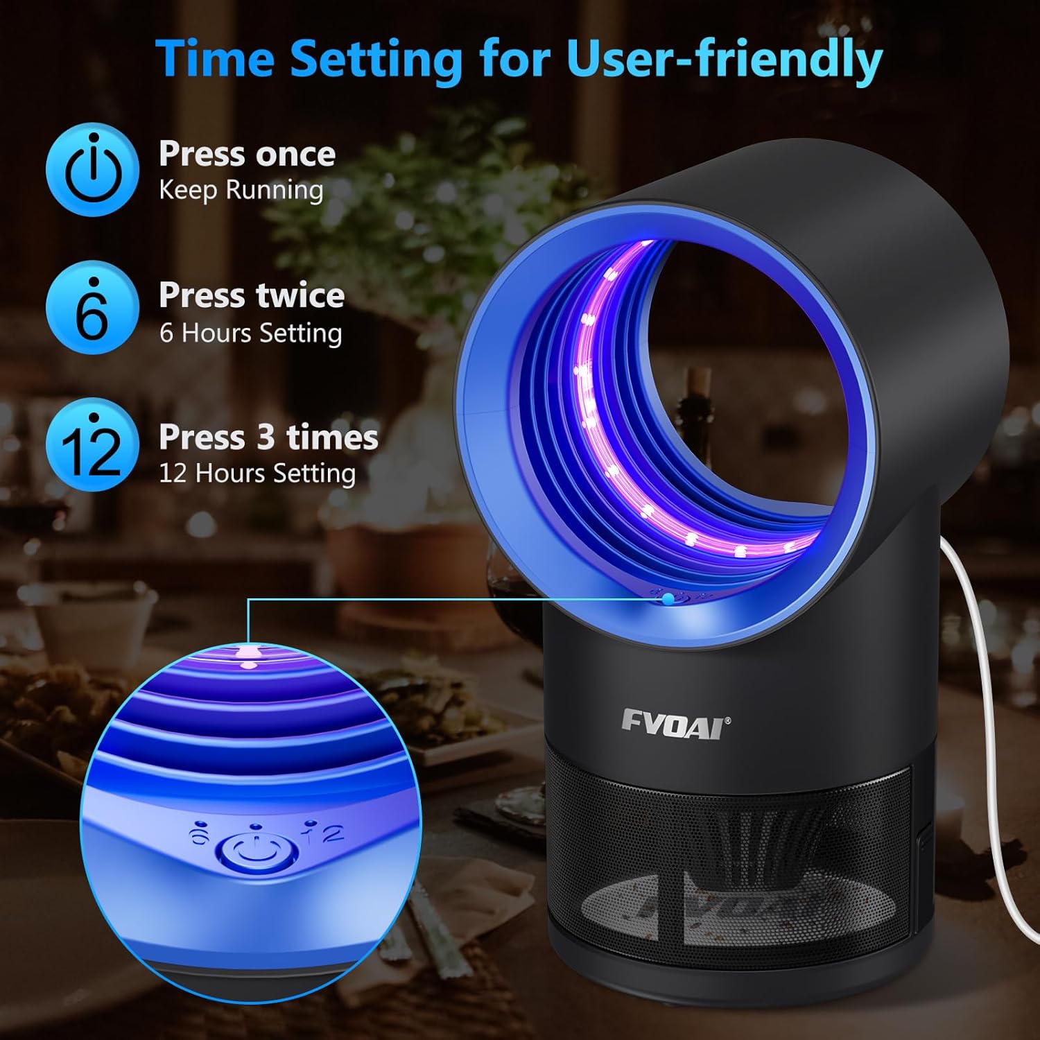 - Time Setting Option: Plug in the usb cable and adapter, press the indoor bug traps on/off button to work. Continuous run or 6/12 hours timing function, more convenient to daily use.