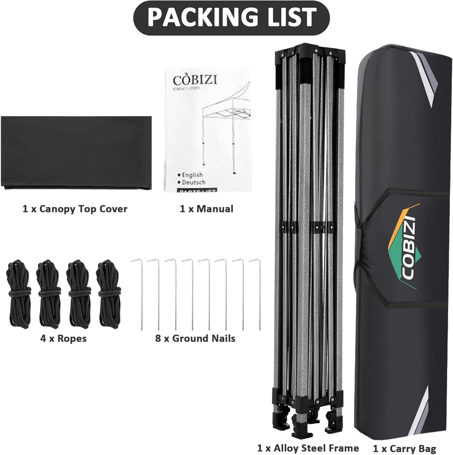 - 【100 SQ Feet Shade Area】COBIZI 10x10 pop up tent provides 100 SQFT spacious covered space, it can easily accommodate 7-10 people, meet your different needs for holding large gatherings. Perfect for wedding, birthday party, market event and other larger events. When in use, always secure the 10x10 pop up tent with the included stakes and ropes to avoid damage. One year after-sale protection for canopy frame; Six months after-sale protection for fabrics and accessories.