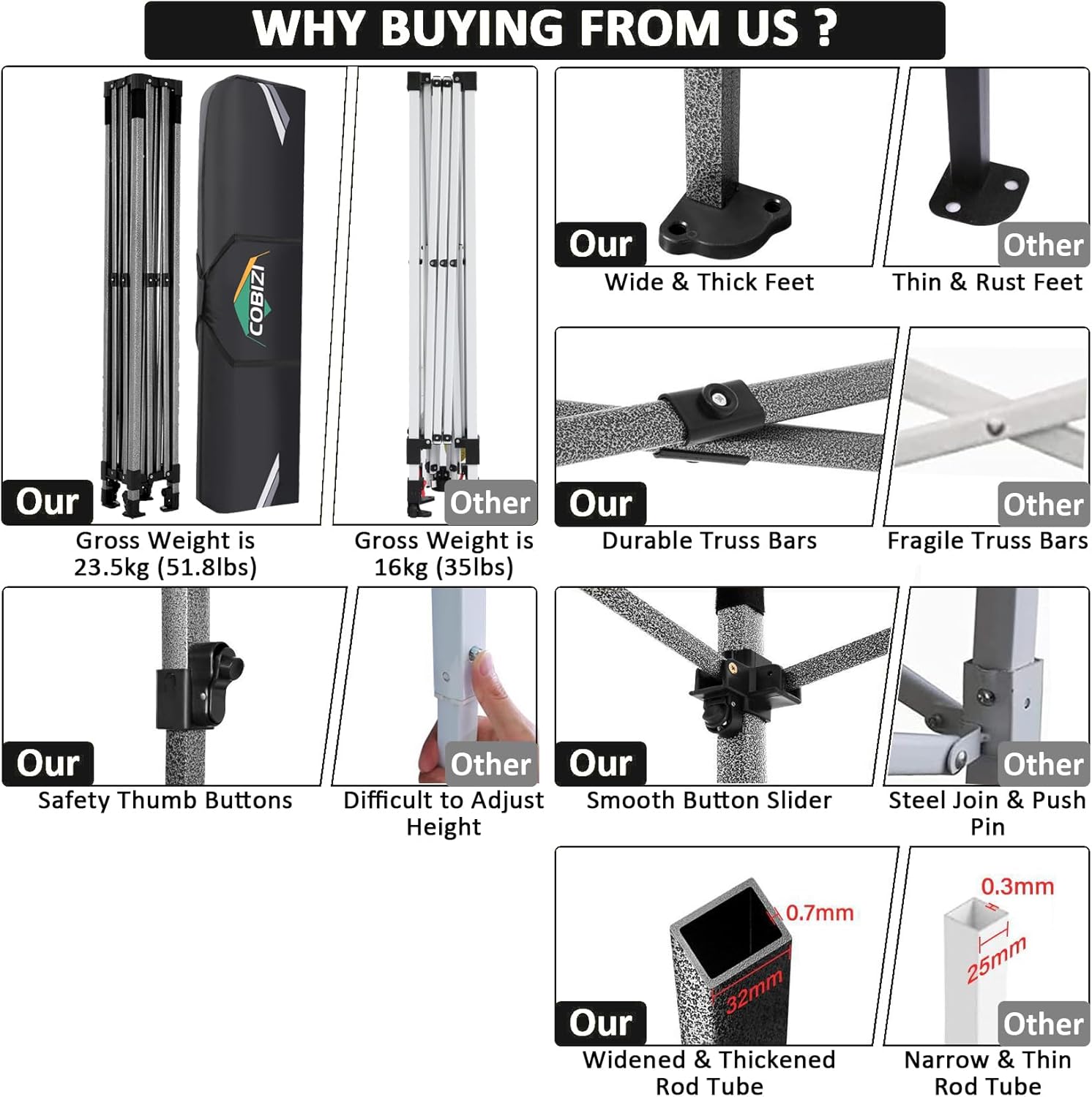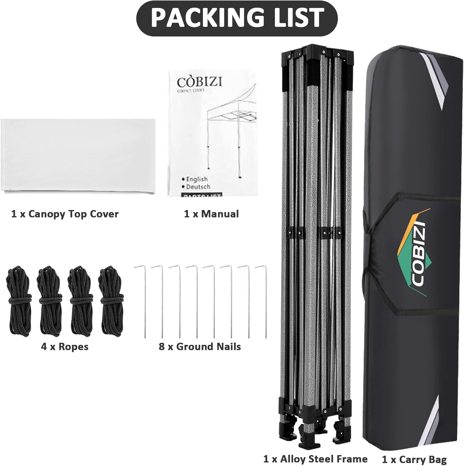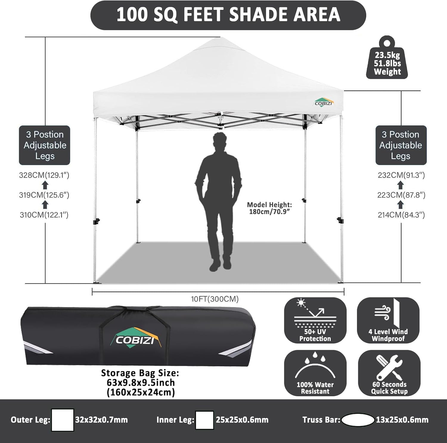 - 【100 SQ Feet Shade Area】COBIZI 10x10 pop up tent provides 100 SQFT spacious covered space, it can easily accommodate 7-10 people, meet your different needs for holding large gatherings. Perfect for wedding, birthday party, market event and other larger events. When in use, always secure the 10x10 pop up tent with the included stakes and ropes to avoid damage. One year after-sale protection for canopy frame; Six months after-sale protection for fabrics and accessories.