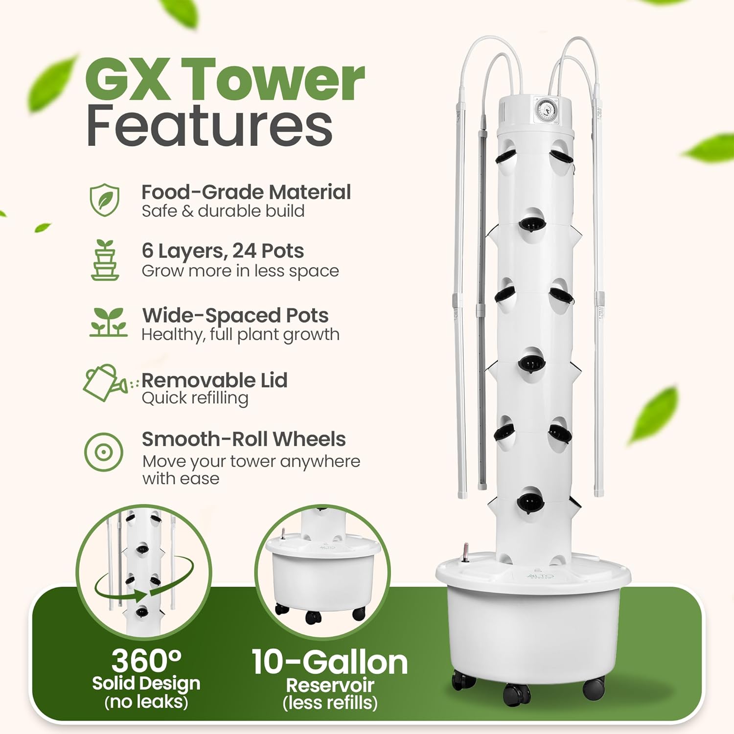- [WHAT’S IN THE BOX] All tower components, reservoir tank with wheels, adjustable LED lights with built-in timer, water pump, timer for water pump, 24 net pots, 30 rockwool cubes, A + B plant nutrients (10 oz each), digital pH test pen, 3-head germination light with clamp, water gauge for easy monitoring.
