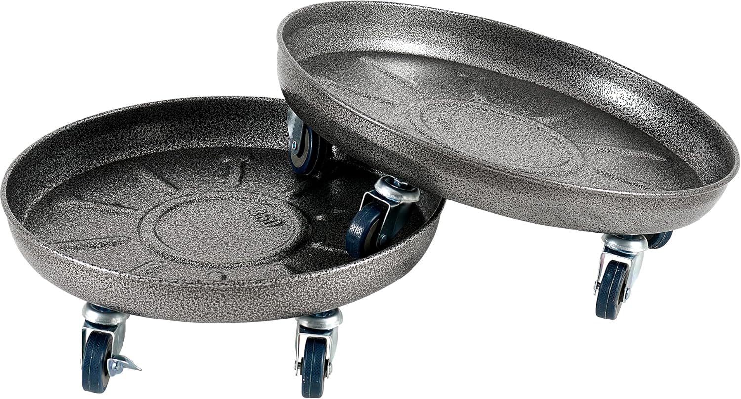 - [Metal tray] The surface of the rolling plant caddy is frosted to increase friction with the bottom of the planter, ensuring that the planter will not topple over during movement. The internal height of the saucer tray is 1inch deep enough, so it can practically catch and hold the overflow