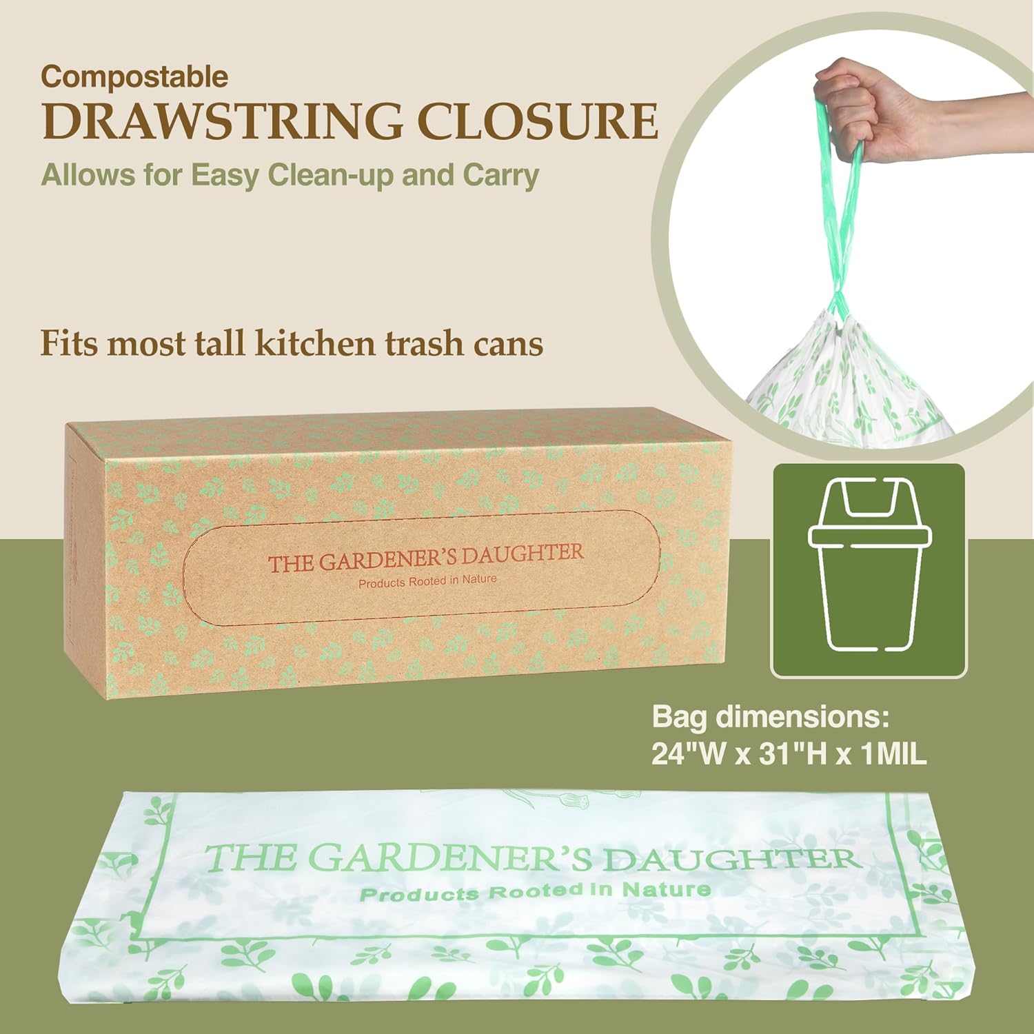 - πΏ 13 Gallon Compostable Trash Bags β Fits Most Tall Kitchen Bins Durable 24"W x 31"H size with drawstring closure for a secure, mess-free fit. Includes 30 plant-based bags per roll.