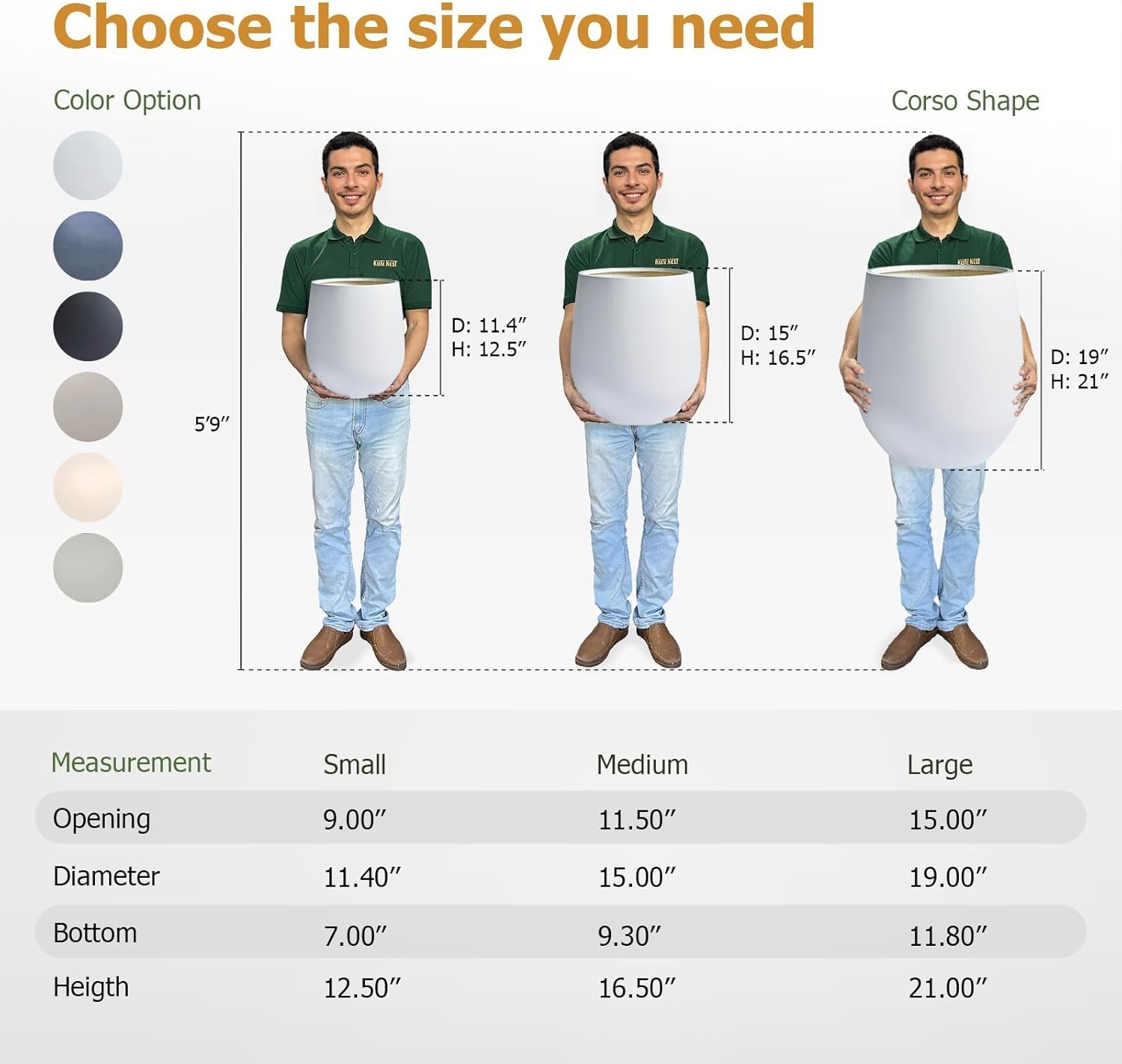- Small Planter: 11.4"D x 12.5"H (9" Pot Opening)
