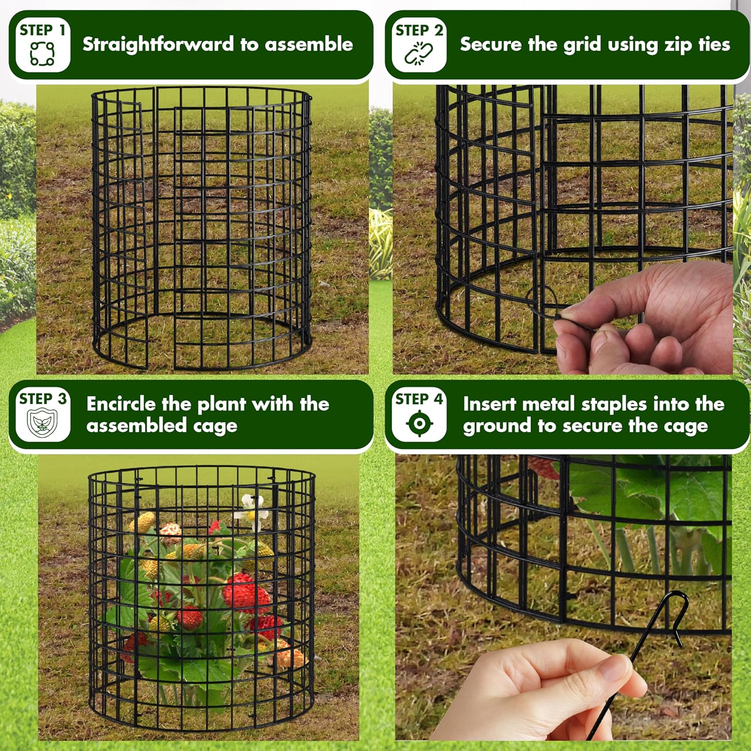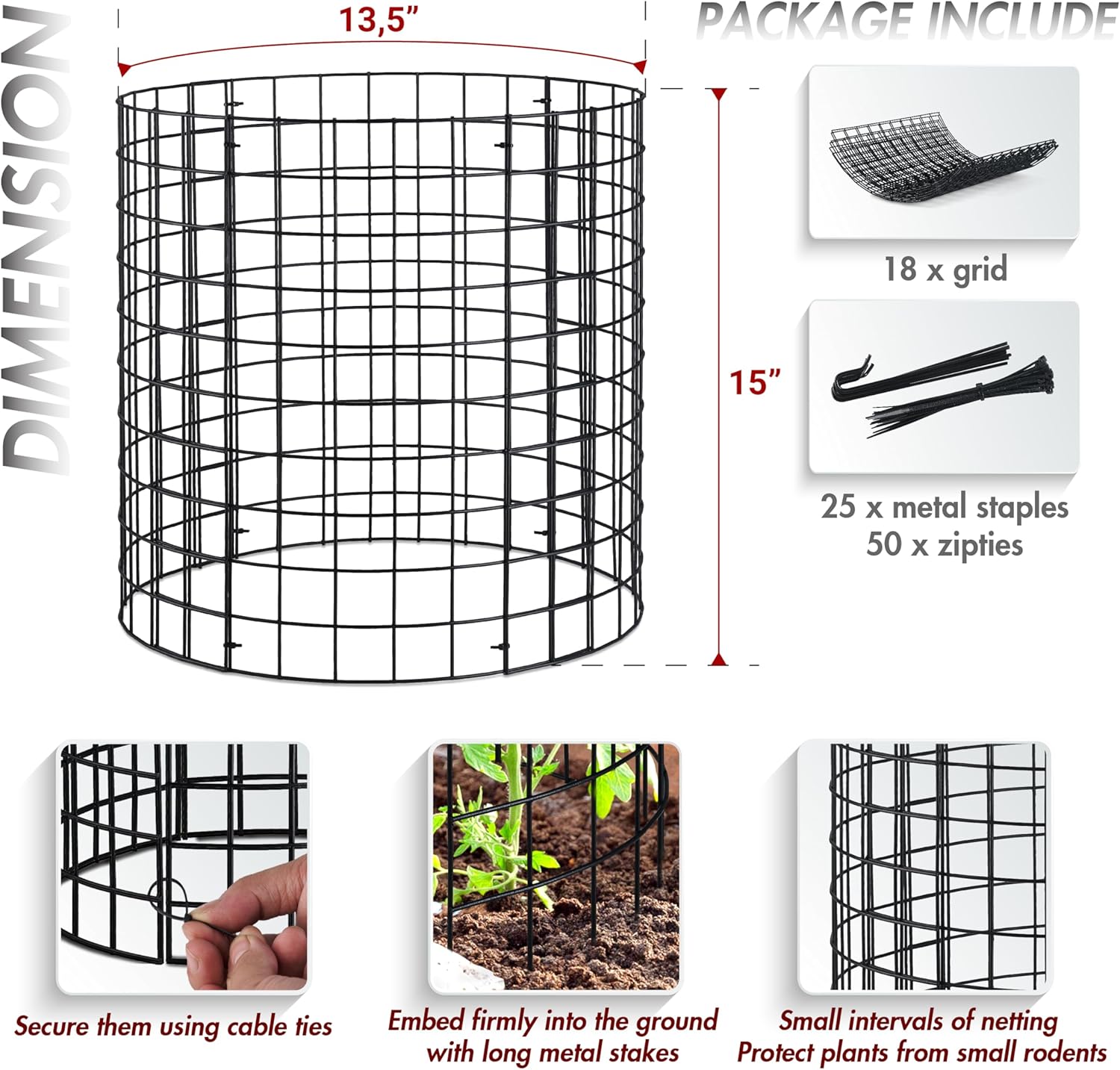 - ๐ฟ Set of 6 Cage Flexible Garden Protection: The wire plant protector kit is designed for both indoor and outdoor use, protecting against environmental elements and animals. It includes 18 mesh panels, 25 ground staples, and 50 zip ties, with each cage measuring 13.5'' in diameter by 15'' in height after assembly. The system allows for the combination of three or more meshes to accommodate larger plants, ensuring ample space for growth and featuring removable grids for convenient storage.
