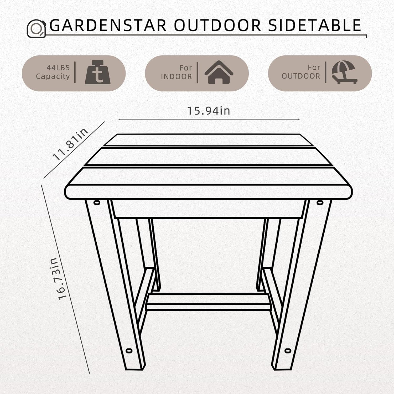 - 【Modern Design Material】GARDENSTAR outdoor side table, made from UV-resistant HDPE, combines the elegance of natural wood with exceptional durability. Unlike traditional wood, it remains sturdy in any climate. The smooth tabletop is easy to clean with soap and water, while sun suppressants ensure long-lasting color without fading or darkening.