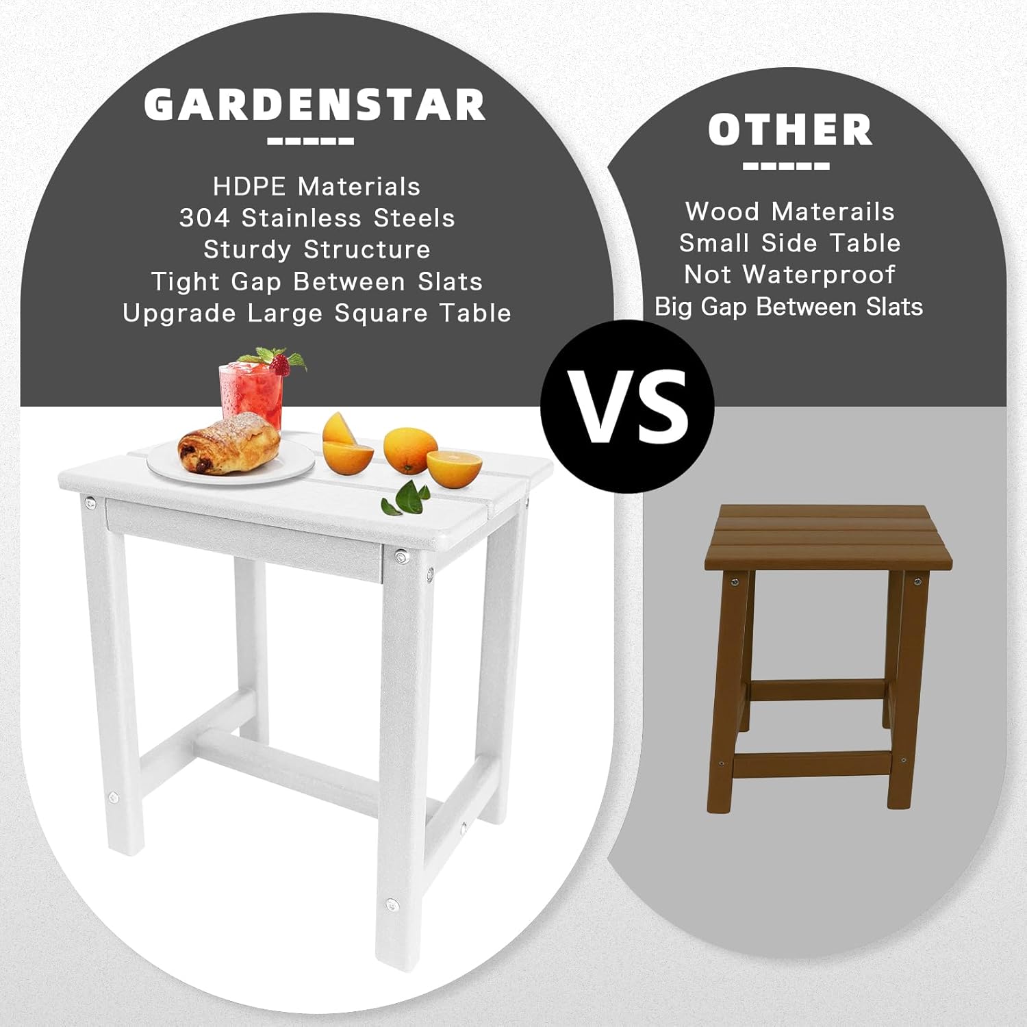 - 【Modern Design Material】GARDENSTAR outdoor side table, made from UV-resistant HDPE, combines the elegance of natural wood with exceptional durability. Unlike traditional wood, it remains sturdy in any climate. The smooth tabletop is easy to clean with soap and water, while sun suppressants ensure long-lasting color without fading or darkening.