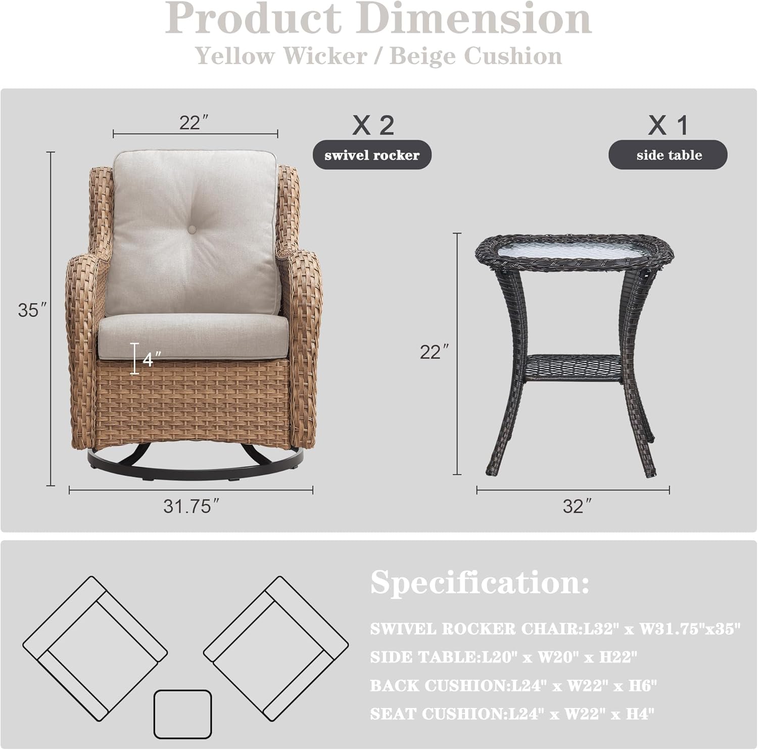 Outdoor Swivel Rocker Patio Chairs - 360 Degree Swivel Glider Seating 350LBS Weight Capacity 3 Piece Wicker Rocking Chairs Set with Side Table for Porch Balcony Deck, Yellow/Beige