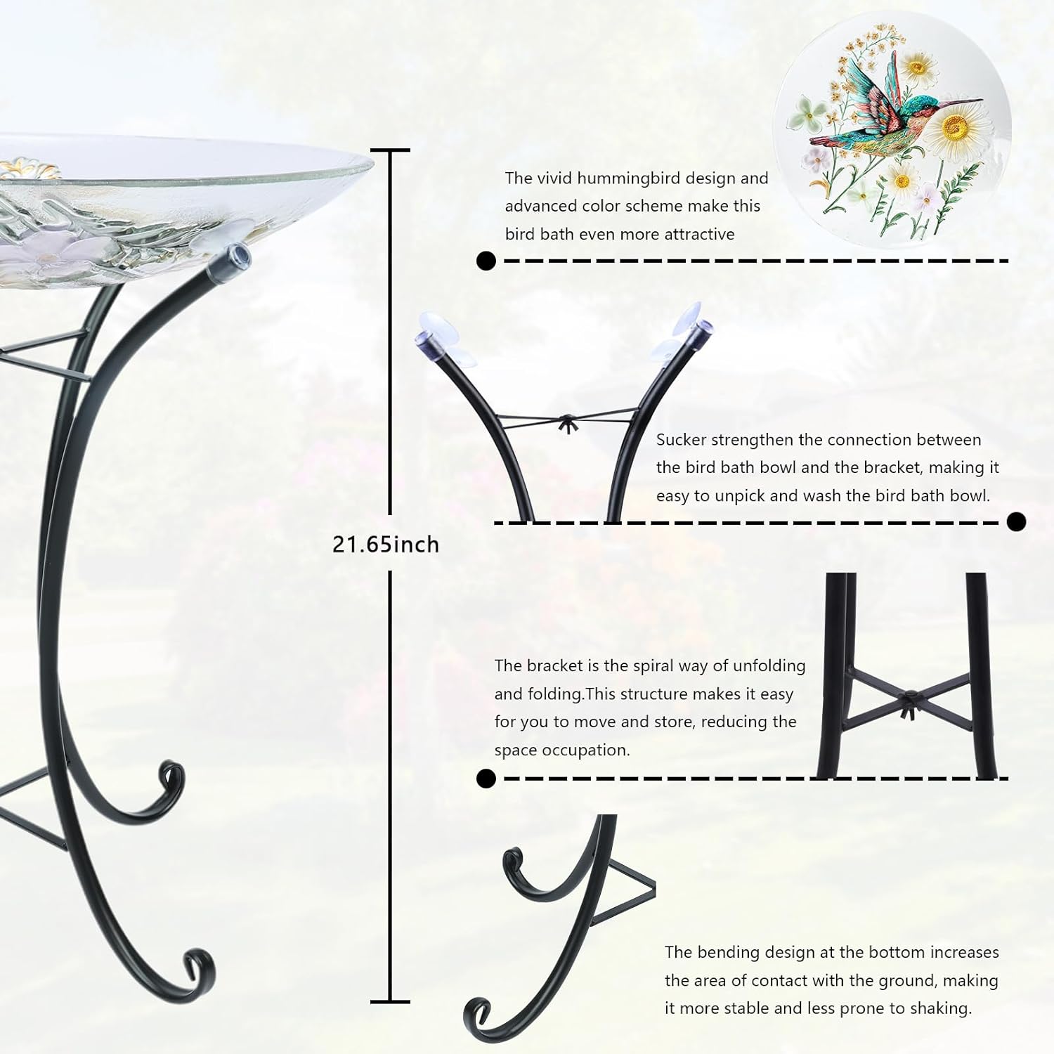 - Easy to place and clean: The folding bracket of the outdoor glass bird bath is designed to be easily stored and moved, and can be placed anywhere you want. The high quality coating on the glass surface allows you to easily remove bird droppings or dirt