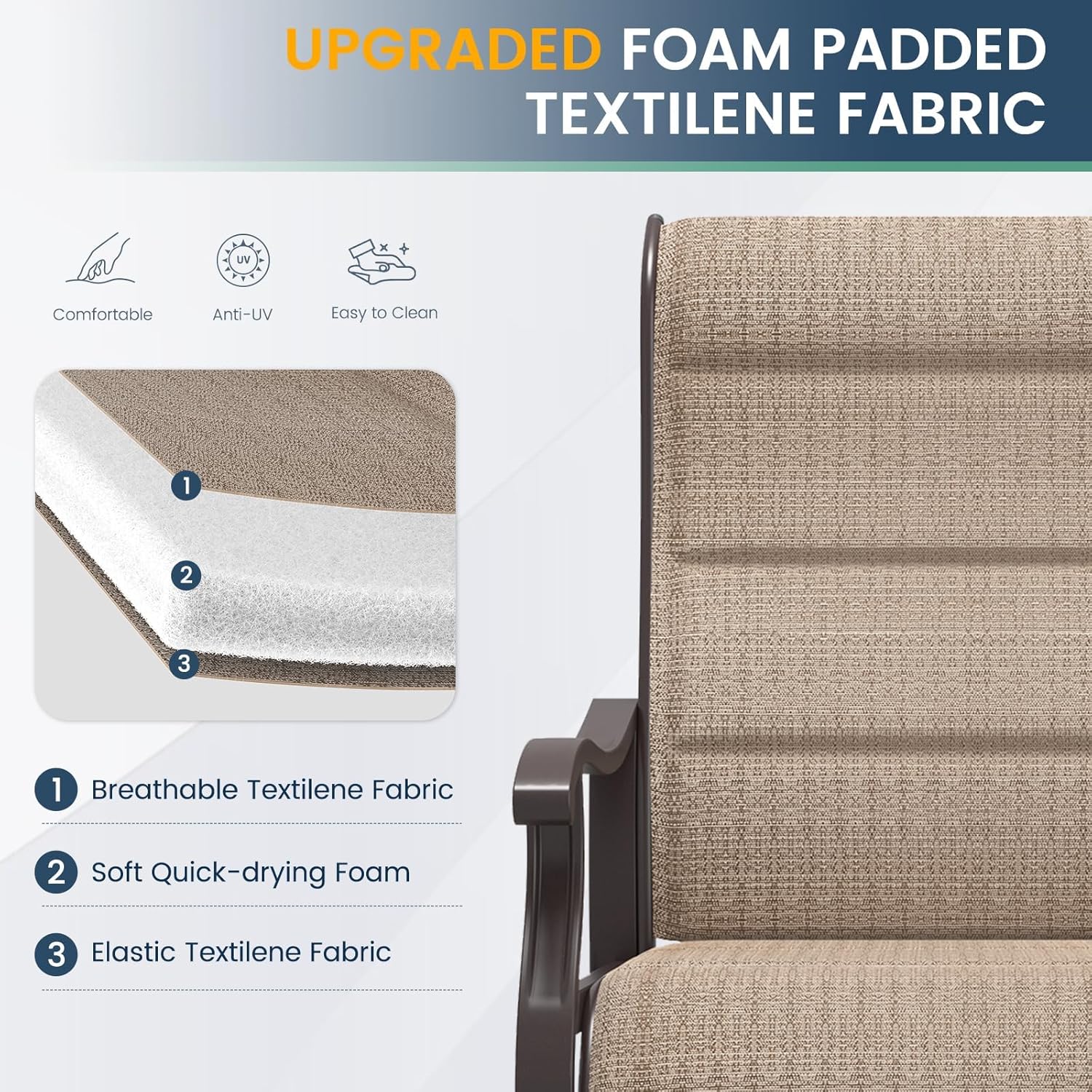 - ăCOMFORTABLE PADDED TEXTILENE FABRICăOur swivel patio chairs are made from a unique padded textile fabric that makes them softer and more comfortable than ordinary chairs while ensuring good breathability. You'll love the soft touch and the comfort of sitting for long periods of time without pains!